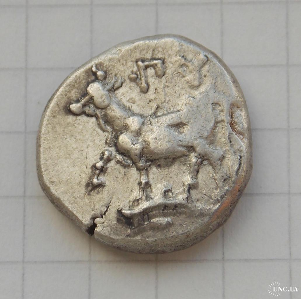 Аверс: ΠY, Телиця з піднятою передньою лівою ногою, що стоїть ліворуч на дельфіні, що пливе ліворуч;