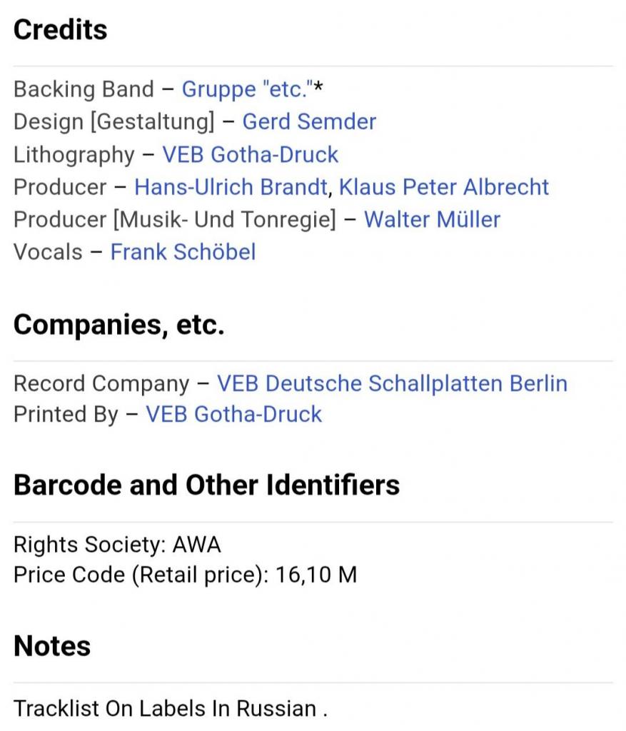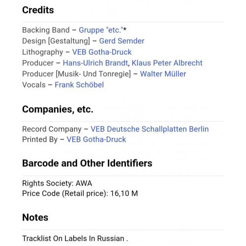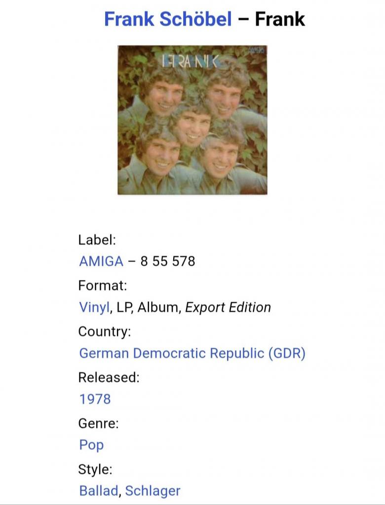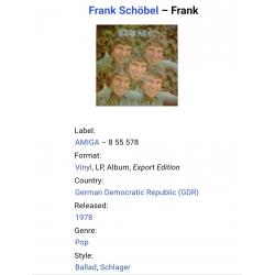 1961-1980Вінілова платівка. Восьмий, в дискографії, студійний альбом одного з найпопулярнішого поп-шлягер виконавця зі Східної Німеччини, Франка Шебеля (Frank) 1978. Випуск фірми (Amiga) GDR, 1978-ий рік. Оригінальне, першопресове, Німецьке експортне видання. Стан платівки ЕХ. Стан конверту ЕХ. Відправка по Україні службами доставки: Нова Пошта, Укр Пошта, Делівері. Також відправляємо посилки за кордон по цілому світу.