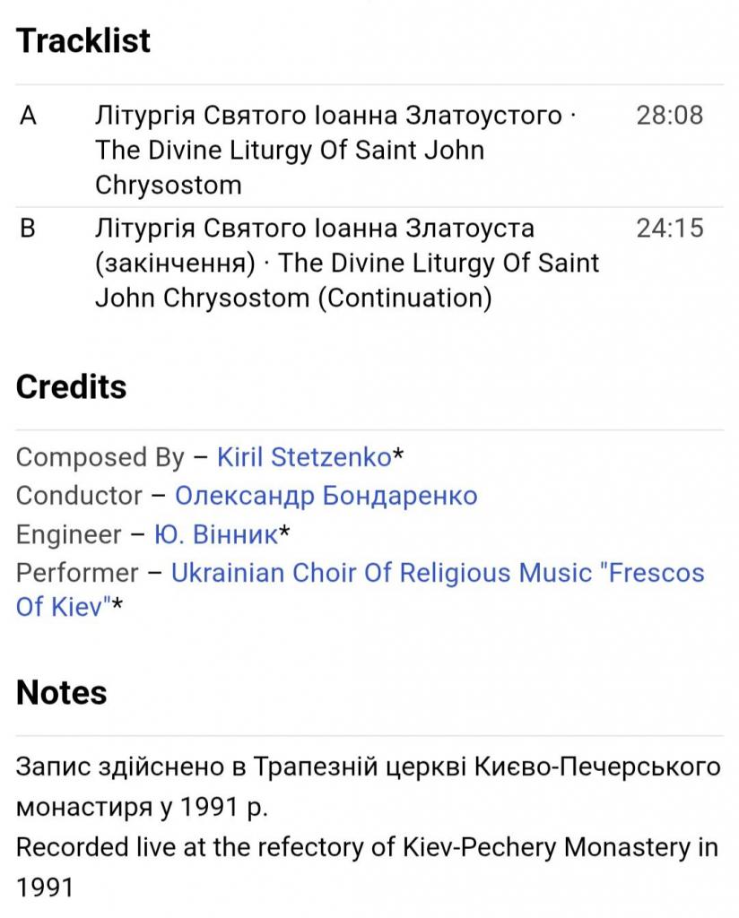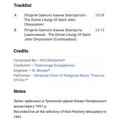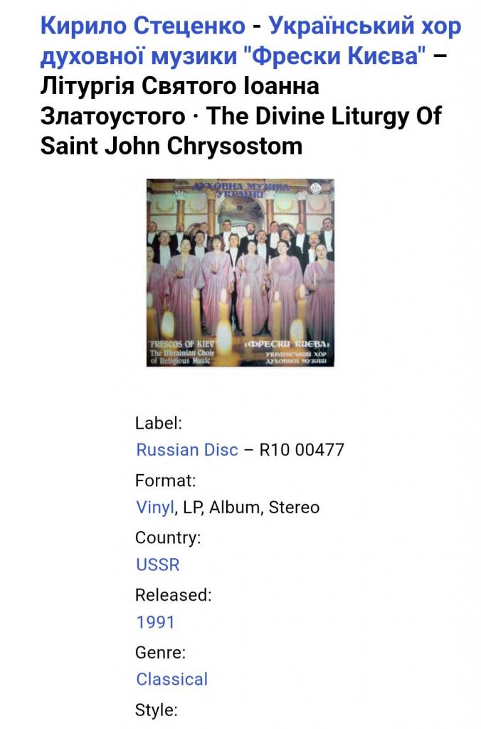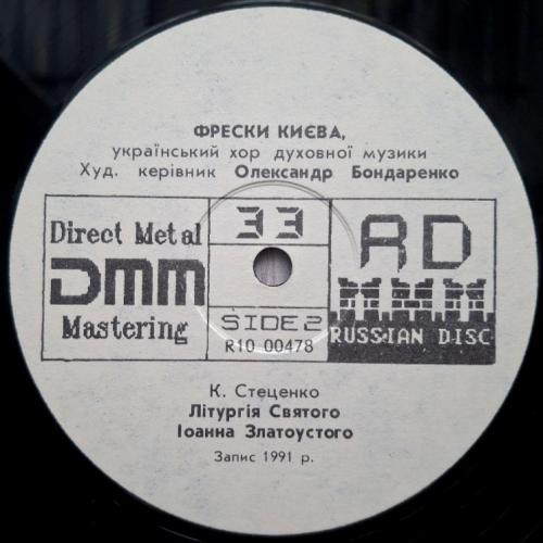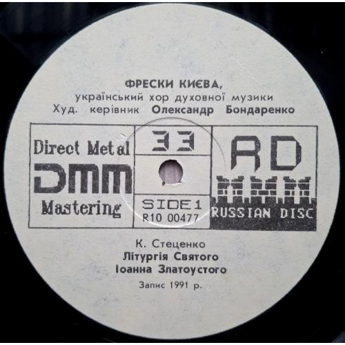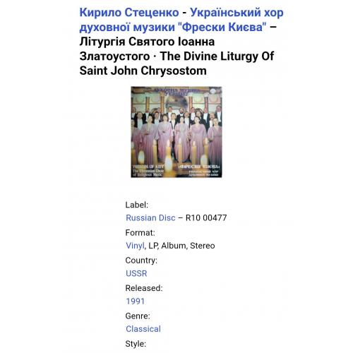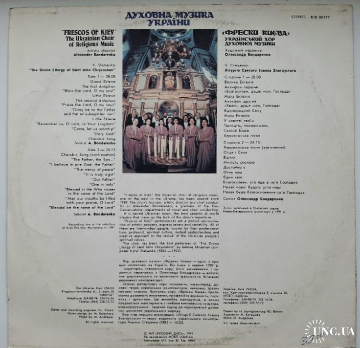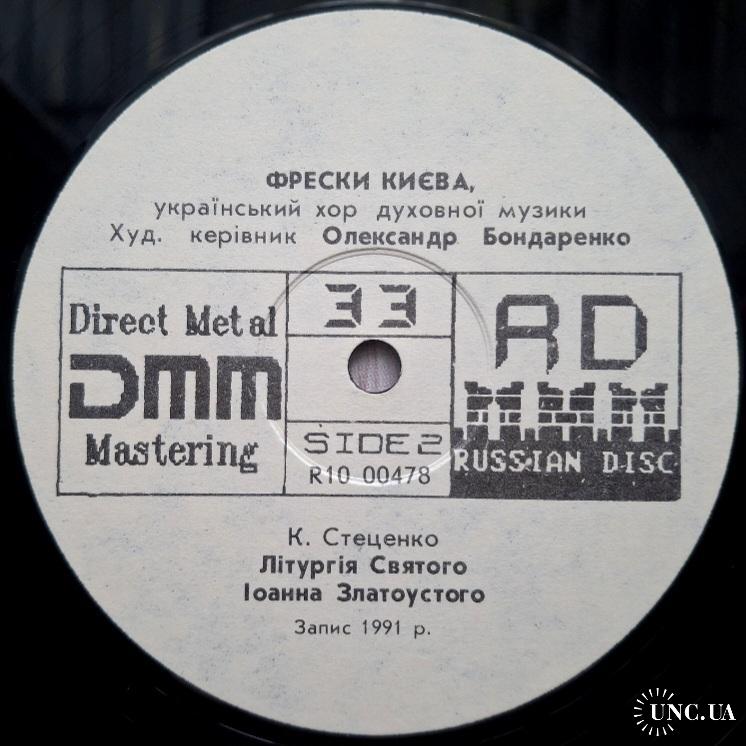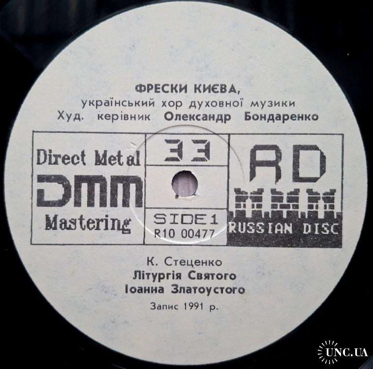 Вінілова платівка. Другий, в дискографії, студійний альбом Українського фольклорного хору духовної музики з Києва, Фрески Києва, заснованого Олександром Бондаренком (Кирило Стеценко - Літургія Святого Іоанна Златоустого) 1991. Випуск фірми (Russian Disc) Russia, 1991-ий рік. Оригінальне, першопресове видання. Лімітований тираж (Limited Edition). Рідкісне (Rare). Стан платівки NM-. Стан конверту NM-/ЕХ+. Відправка по Україні службами доставки: Нова Пошта, Укр Пошта, Делівері. Також відправляємо посилки за кордон по цілому світу.
