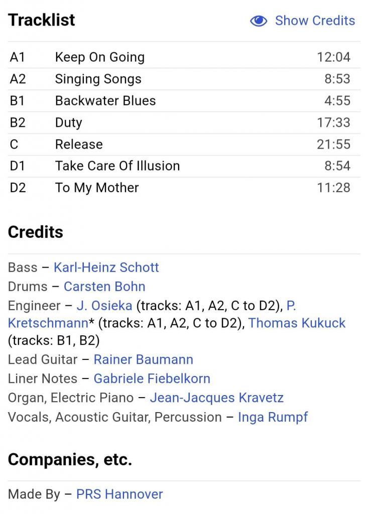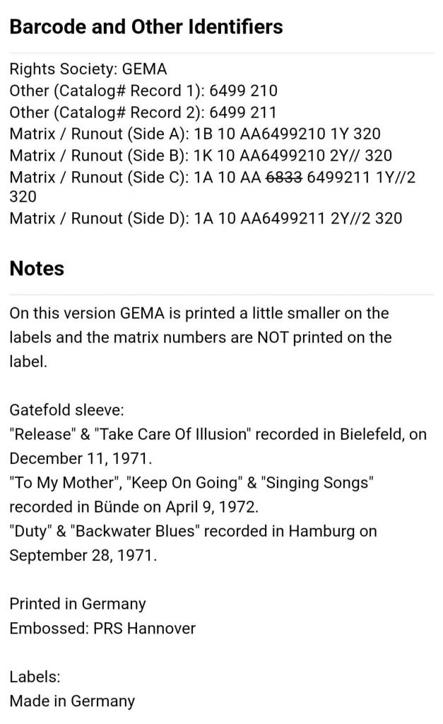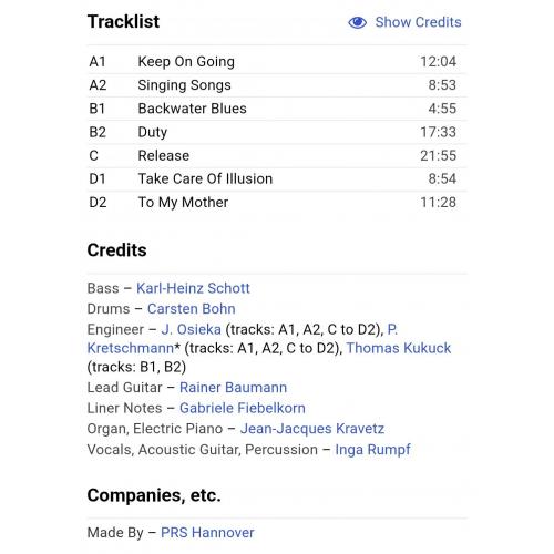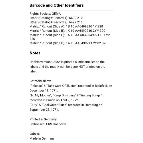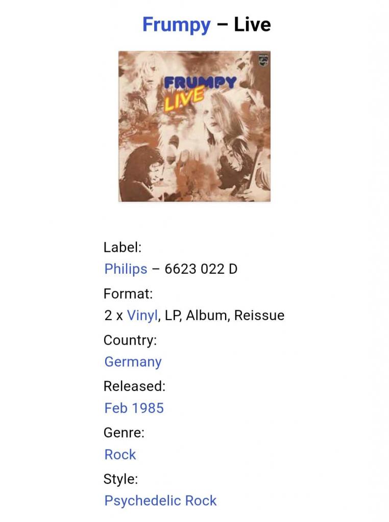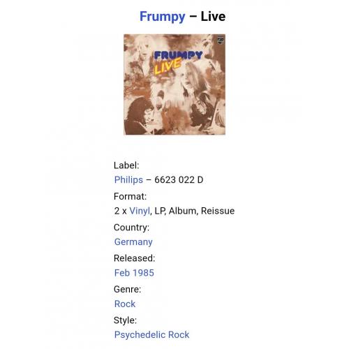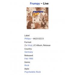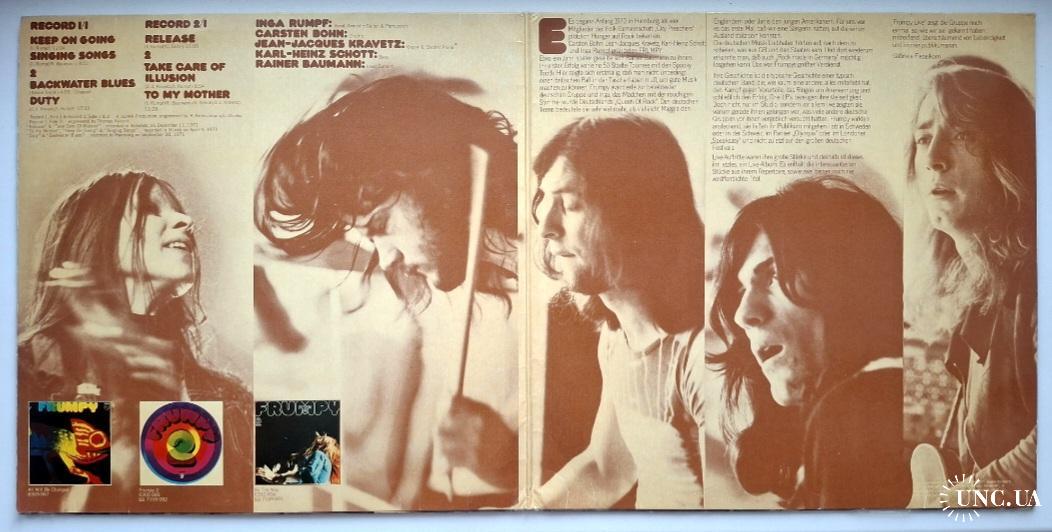 Вінілова платівка. Живий виступ. Офіційний, в дискографії, концертний альбом Німецької психоделік-рок, краут-рок, прог-рок групи із Гамбурга, Frumpy, до складу якої входили Інга Румпф, Жан-Жак Кравец, Рейнер Бауман, Карл-Хайнц Шок, Карстен Бон, Ервін Кама та Томас Кречмер (Live) 1973. Випуск фірми (Philips) Germany, 1985-ий рік. Видання з двох платівок (2LP). Стан платівок ЕХ. Конверт розворотний (Gatefold). Стан конверту ЕХ. Відправка по Україні службами доставки: Нова Пошта, Укр Пошта, Делівері. Також відправляємо посилки за кордон по цілому світу.