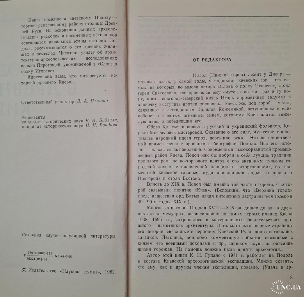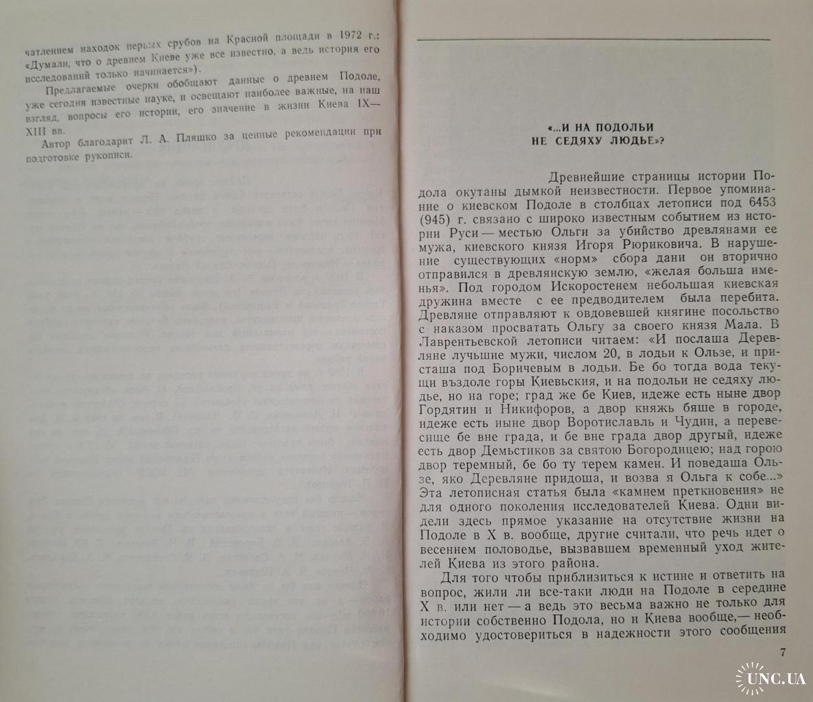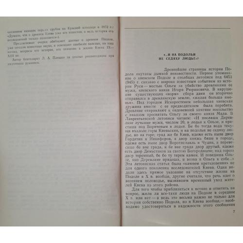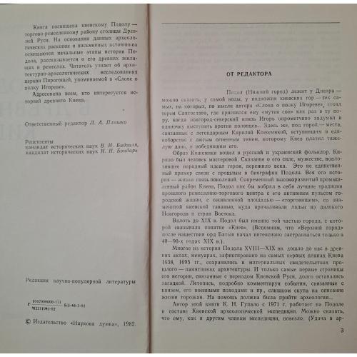 Науково-популярне видання присвячене Нижньому городу (київському Подолу) - торгівельно-ремісничому району столиці Древньої Русі, на основі археологічних розкопок та письмових витоків. Окремо присвячений розділ дослідженню церкв Пирогощі, яка згадується у "Слово о полку Ігоря".