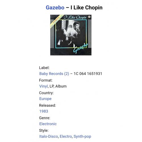 Вінілова платівка. Перший, дебютний, в дискографії, студійний альбом Італійського виконавця Ліванського походження, стилю італо диско, євро диско, Пола Мадзоліні, більше відомого під сценічним ім'ям Газебо (I Like Chopin) 1983. Випуск фірми (Baby Records) Germany, 1983-ій рік. Оригінальне, першопресове, Німецьке видання. Стан платівки ЕХ. Конверт глянцевий. Стан конверту ЕХ. В комплекті внутрішня вставка (OIS). Відправка по Україні службами доставки: Нова Пошта, Укр Пошта, Делівері. Також відправляємо посилки за кордон по цілому світу.