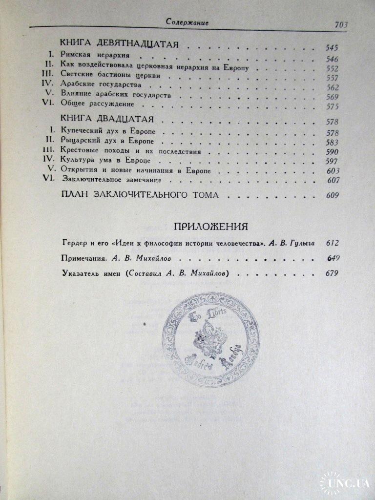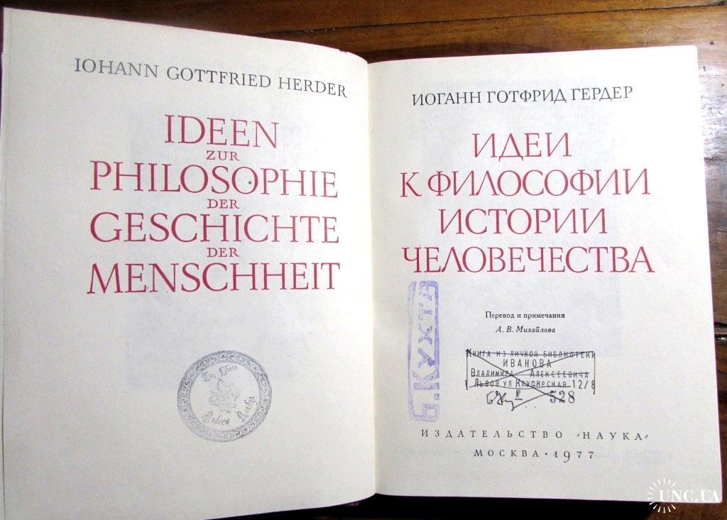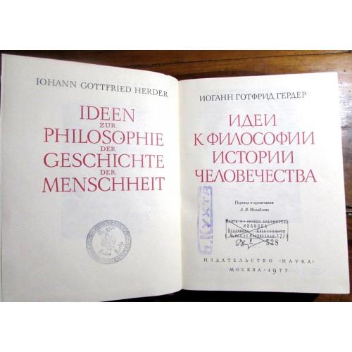 Сегодня имеем честь представить настоящим книголюбам, коллекционерам и любителям мировой истории редкий нынче выпуск из престижной академической серии книг «Памятники исторической мысли» - первое полное русское издание эпохального труда ГЕРДЕРА(1744 - 1803) «Идеи к философии истории человечества» (Рига-Лейпциг,1784-1791 гг.). Книга вышла в 1977 годув Москве под редакцией выдающегося русского германиста А. В. Гулыга, который написал и обширную статью, освещающую философское и культурологическое значение этого труда Гердера. Полный русский перевод, текстологическую и научную подготовку книги блестяще осуществил известный эрудит по вопросах немецкой философии и эстетики А. В. Михайлов.