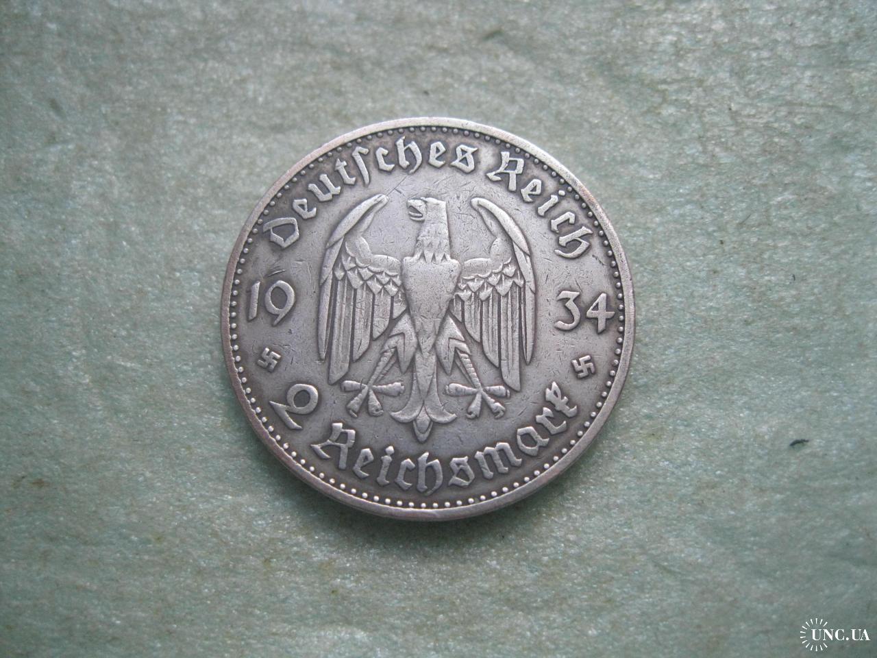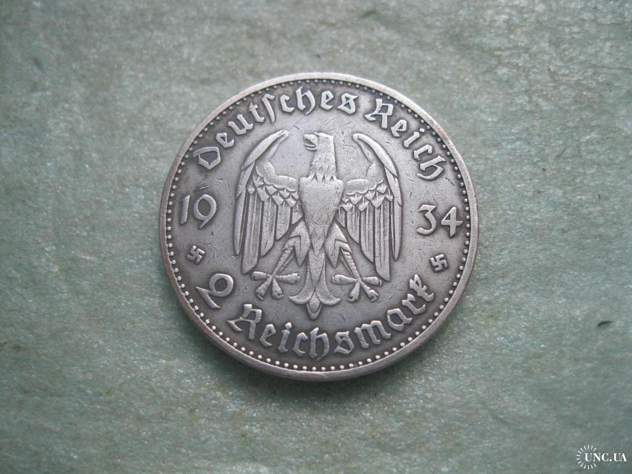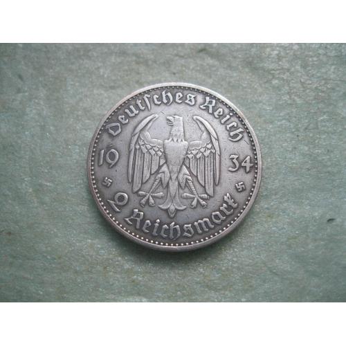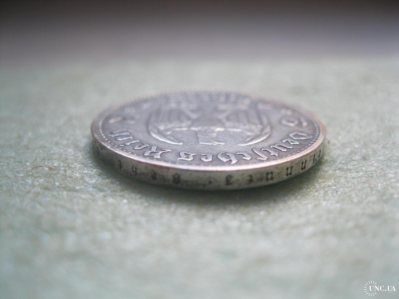 ОригіналГЕРМАНИЯ.2 Марки 1934 г А, Кирха с датой 1933 г. ТРЕТИЙ РЕЙХ. Серебро.Оригинал. (2).У монеты красивый гурт.