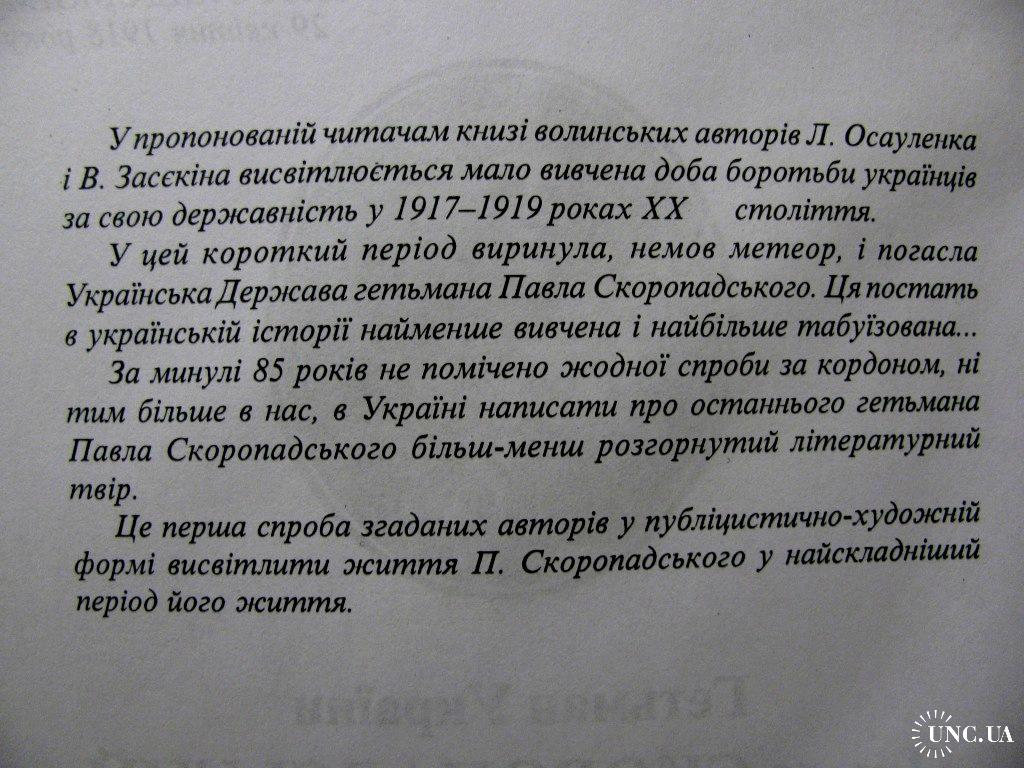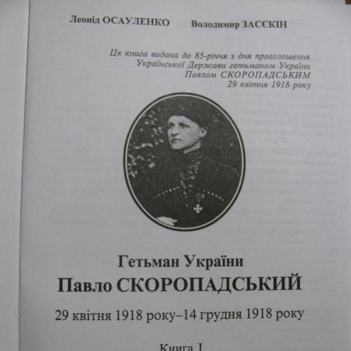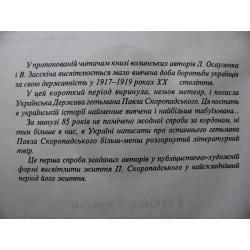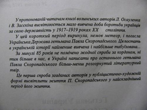 У книзі волинських авторів Л. Осауленка і В. Засєкіна висвітлюється мало вивчена доба боротьби українців за свою державність у 1917–1919 роках XX століття.У цей короткий період виринула, немов метеор, і погасла Українська Держава гетьмана Павла Скоропадського. Ця постать в українській історії найменше вивчена і найбільше табуїзована…