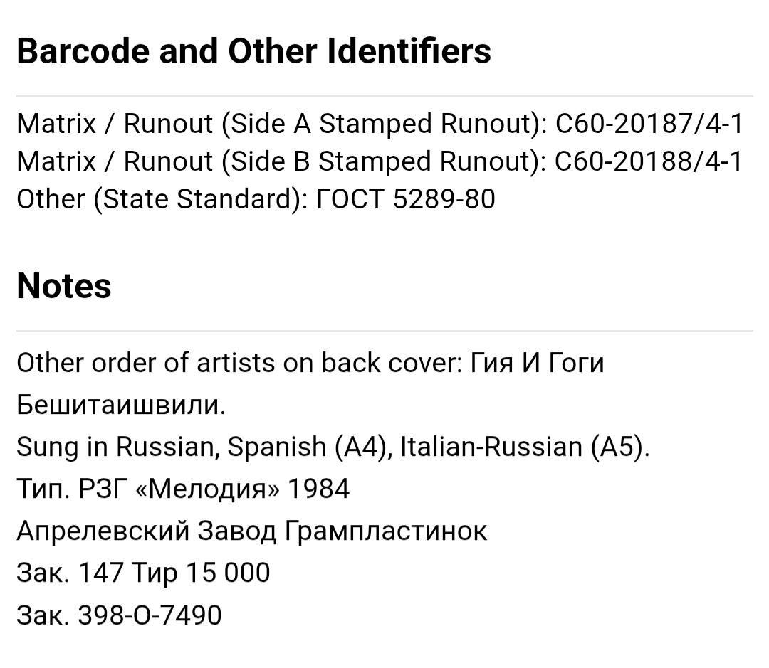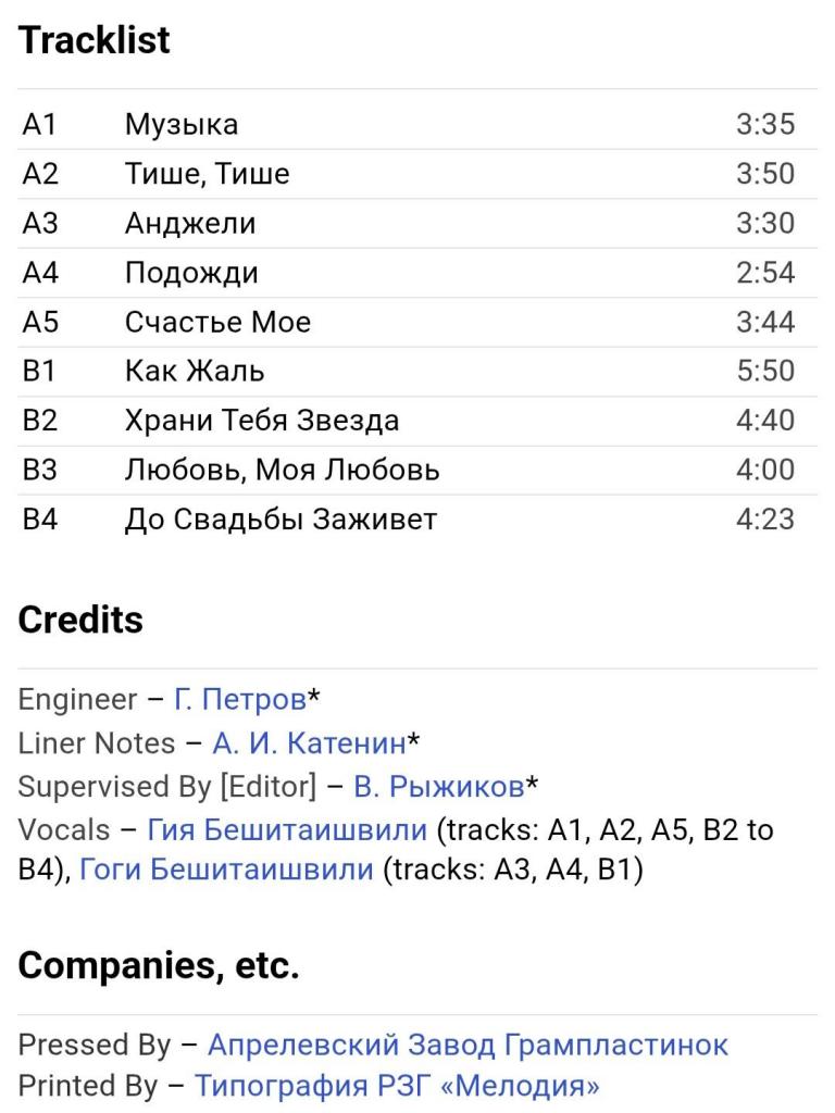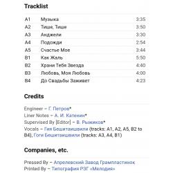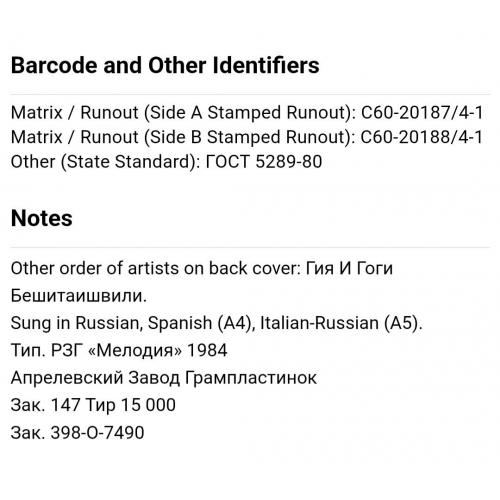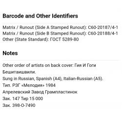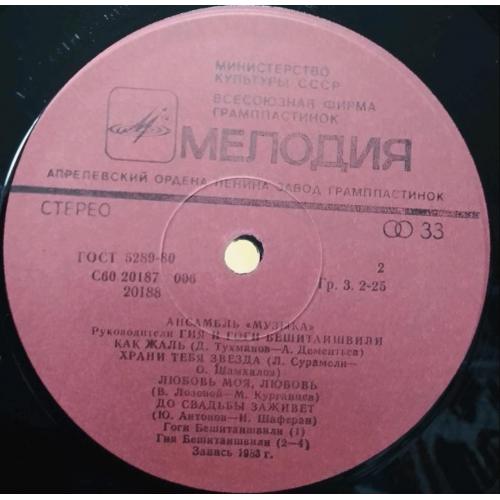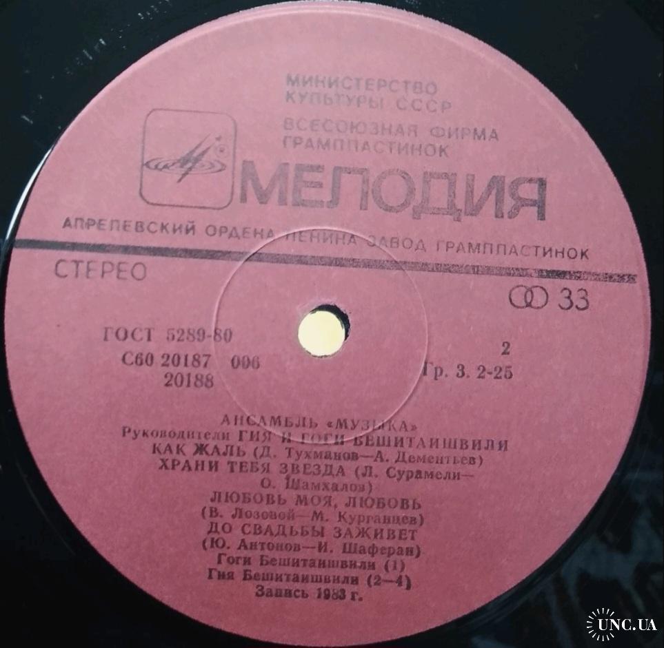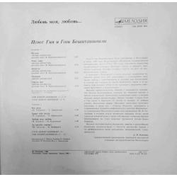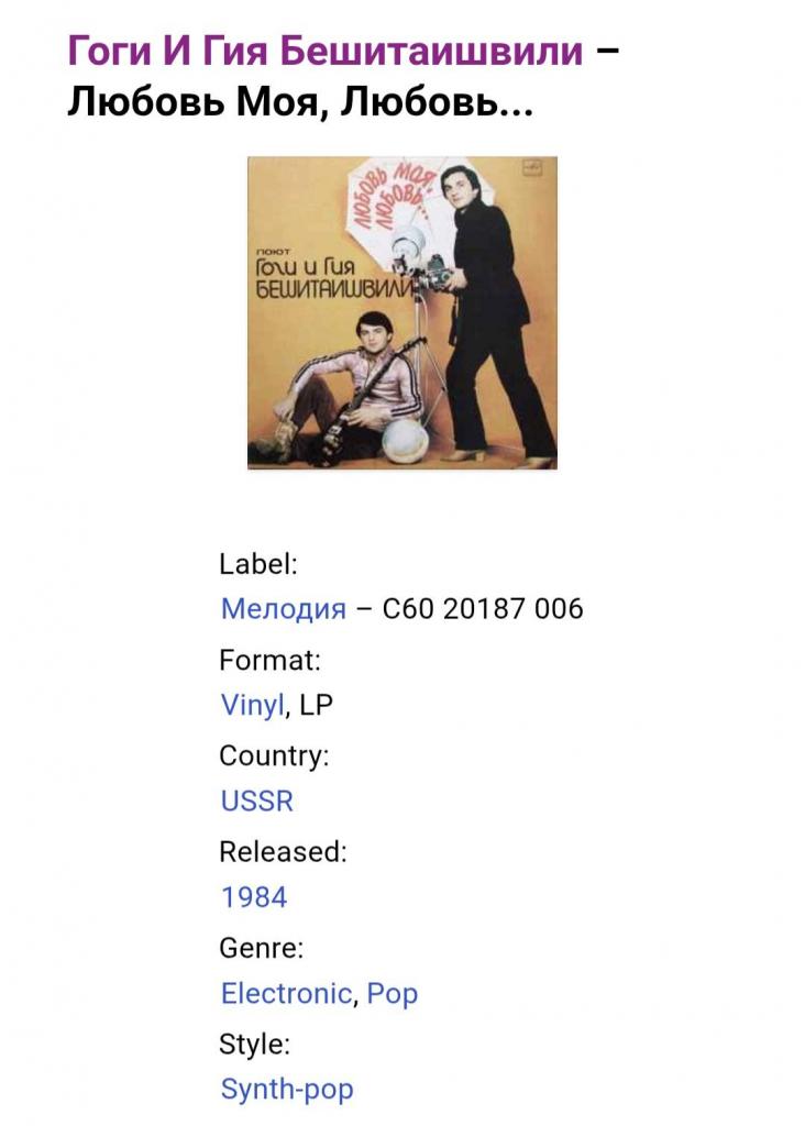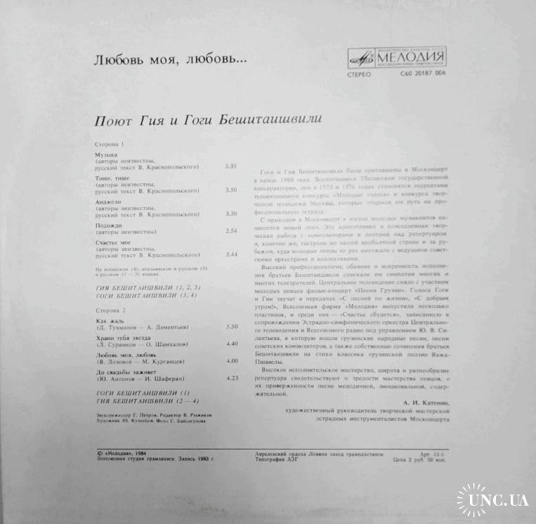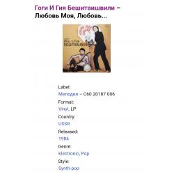 Вінілова платівка. Єдиний, повномасштабний, студійний альбом, Грузинських (радянських) братів-виконавців стилю ретро-поп, Гогі і Гія Бешитаішвілі (Любовь Моя, Любовь) 1983. Випуск фірми (Мелодія) СРСР, Апрелєвський завод грамплатівок, 1984-ий рік. Рідкісне видання (Rare). Лімітований тираж (Limited Edition). Платівка нова, неіграна, під голкою не була. Категорія М (Mint). Стан конверту NM-. Відправка по Україні службами доставки: Нова Пошта, Укр Пошта, Делівері. Також відправляємо посилки за кордон по цілому світу.