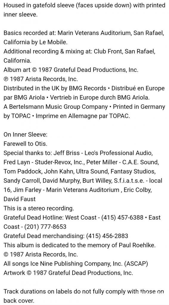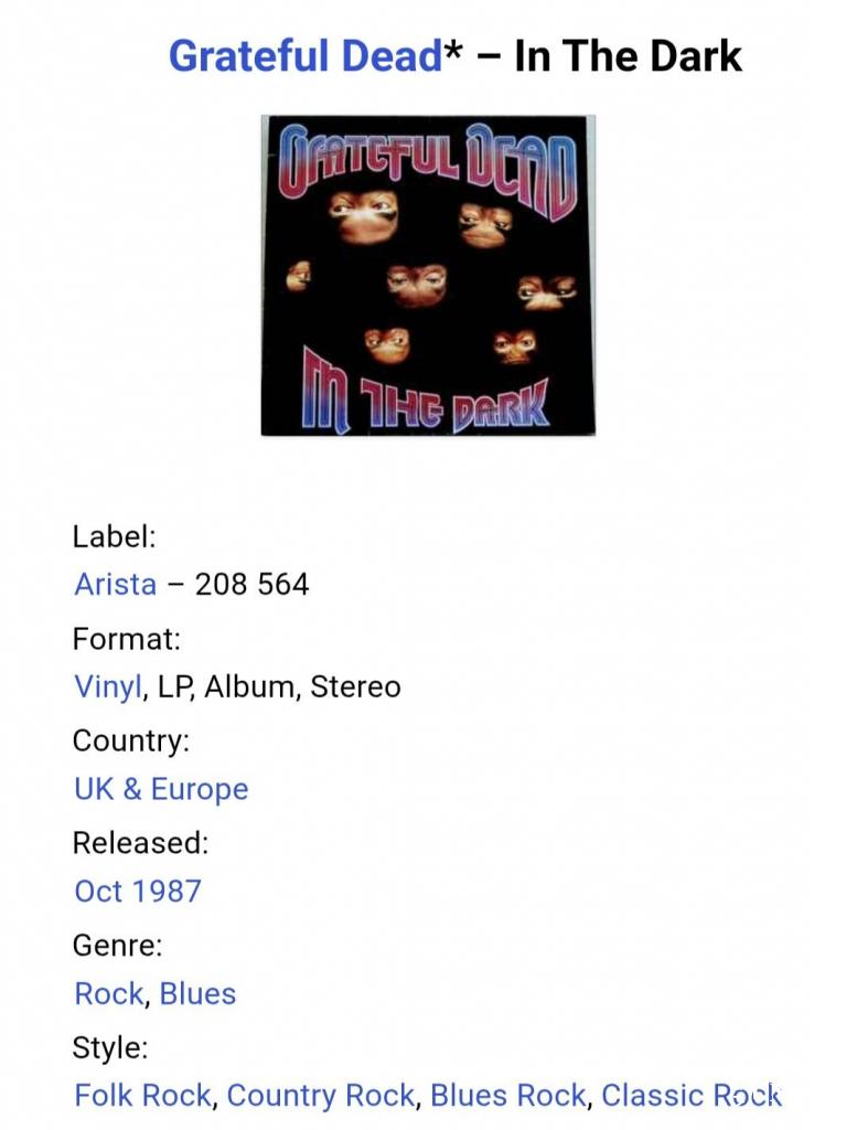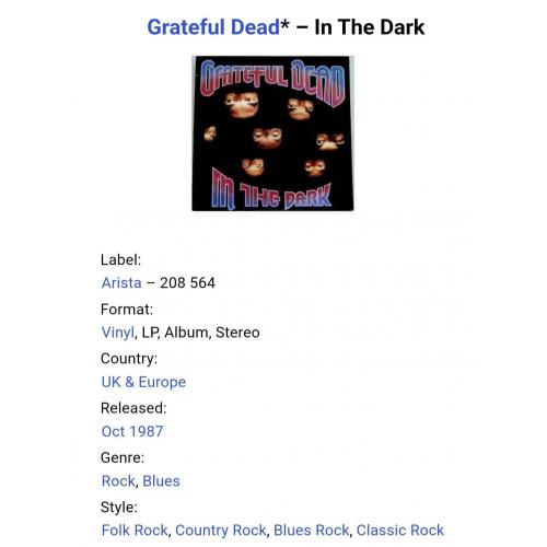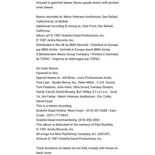 Вінілова платівка. Двадцять четвертий, в дискографії, студійний альбом, Американської блюз-рок, прог-рок, фольк-рок, кантрі-рок групи із Пало-Альто, Grateful Dead, до складу якої, на той час, входили учасники Джеррі Гарсія, Боб Вейр, Філ Леш, Білл Кройцманн, Мікі Харт та Брент Мідланд (In The Dark) 1987. Випуск фірми (Arista) UK & Germany, 1987-ий рік. Оригінальне, першопресове видання. Стан платівки ЕХ+. Конверт глянцевий, розворотний (Gatefold). Стан конверту EX+. В комплекті внутрішня вставка (OIS). Відправка по Україні службами доставки: Нова Пошта, Укр Пошта, Делівері. Також відправляємо посилки за кордон по цілому світу.