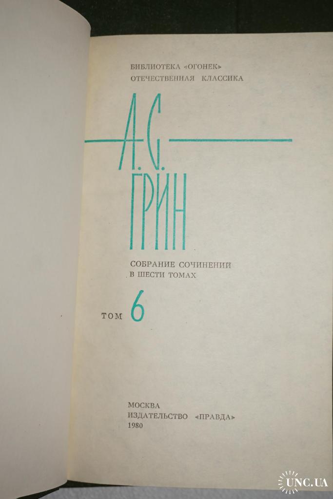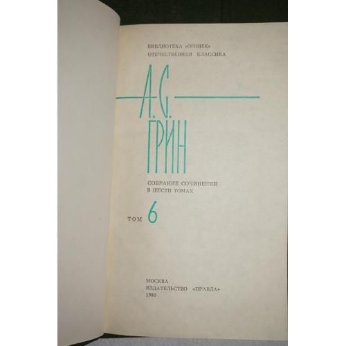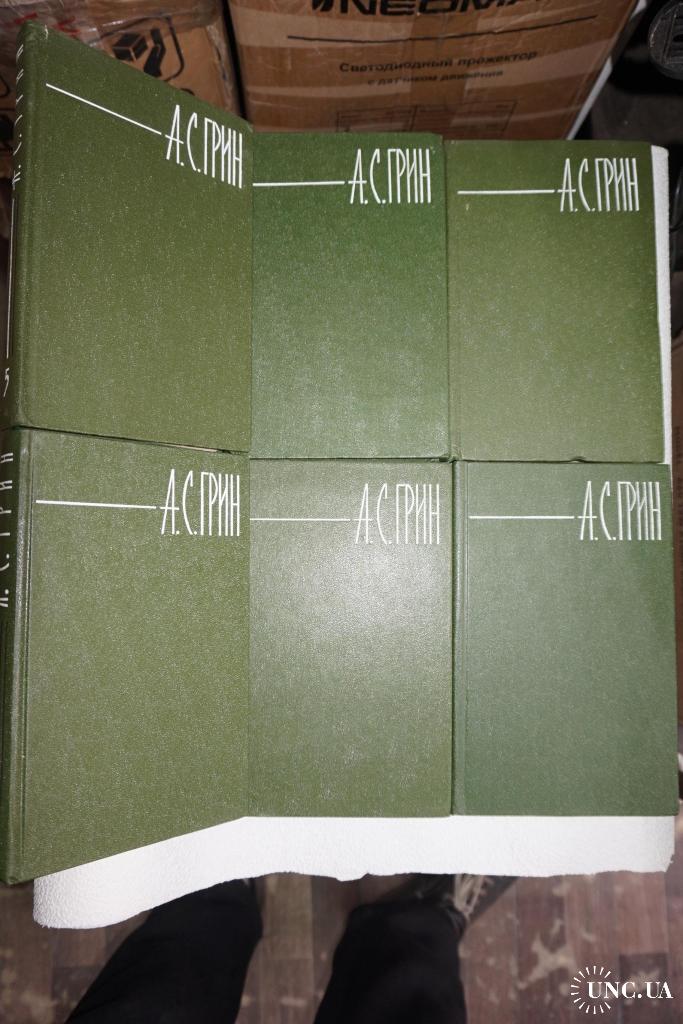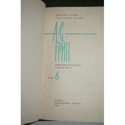 Содержание: Том 1. Шапка-невидимка. Штурман ``Четырех ветров``. Пролив бурь., Том 2. Позорный столб. Загадочные истории. Знаменитая книга., Том 3. Алые паруса. Блистающий мир. Искатель приключений. Расказы, включенные А.С.Грином в список произведений для собрания сочинений издательства ``Мысль``., Том 4.Золотая цепь. Серце пустыни. На облачном берегу. Расказы, включенные А.С.Грином в список произведений для собрания сочинений издательства ``Мысль`` (продолжение). Рассказы 1908-1916 гг. печатавшиеся в периодике., Том 5. Бегущая по волнам. Джесси и Моргиана. По закону. Расказы, включенные А.С.Грином в список произведений для собрания сочинений издательства ``Мысль`` (продолжение)., Том 6. Дорога никуда. Брак Августа Эсборна... Огонь и вода. Рассказы 1918-1930 гг. печатавшиеся в периодике. Иллюстрации на отдельных листах.