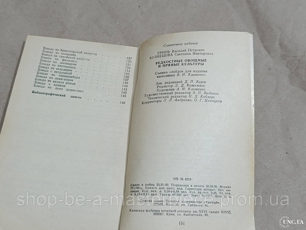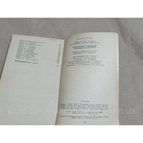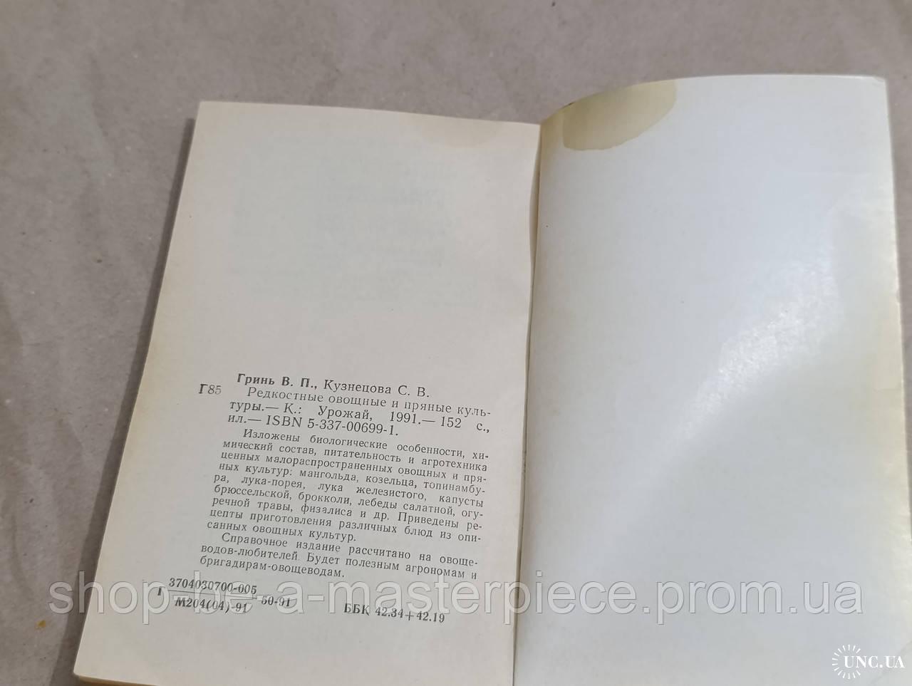 Гринь В. П., Кузнецова С. В. Редкостные овощные и пряные культуры 1991 Мягкая глянцевая обложка Есть потертости. На задней обложке пятно К.: Урожай, 1991.- 152 с., ил. ISBN 5-337-00699-1. Справочное издание ГРИНЬ Василий Петрович КУЗНЕЦОВА Светлана Викторовна Съемка слайдов в для издания выполнена В. Н. Клименко Зав. редакцией Д. П. Корж Редактор Л. Д. Кожемяко Художник А. Н. Клименко Художественный редактор А. П. Видоняк Технический редактор Н. Д. Кобзарь Корректоры Л. Л. Андреева, О. Г. Цехоцкая Изложены биологические особенности, химический состав, питательность и агротехника ценных малораспространенных овощных и пряных культур: мангольда, козельца, топинамбура, лука-порея, лука железистого, капусты брюссельской, брокколи, лебеды салатной, огуречной травы, физалиса и др. Приведены рецепты приготовления различных блюд из описанных овощных культур. Справочное издание рассчитано на овощеводов-любителей Будет полезным агрономам и бригадирам-овощеводам.Відповіді продавця на ваші питання