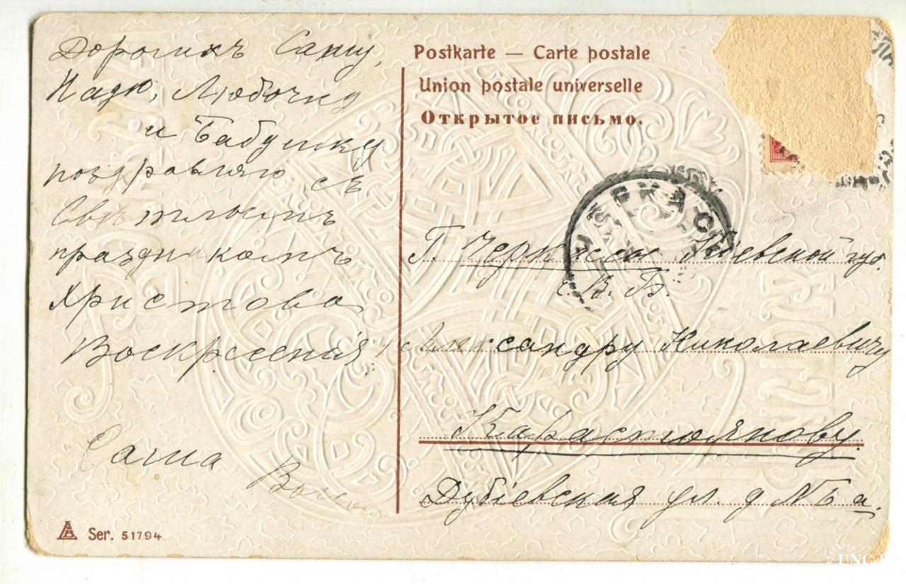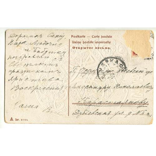 1901-1920ХРИСТОС ВОСКРЕСЕ!. Пасхальное яйцо. Адресовка в Черкассы. Марка сорвана.
