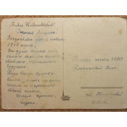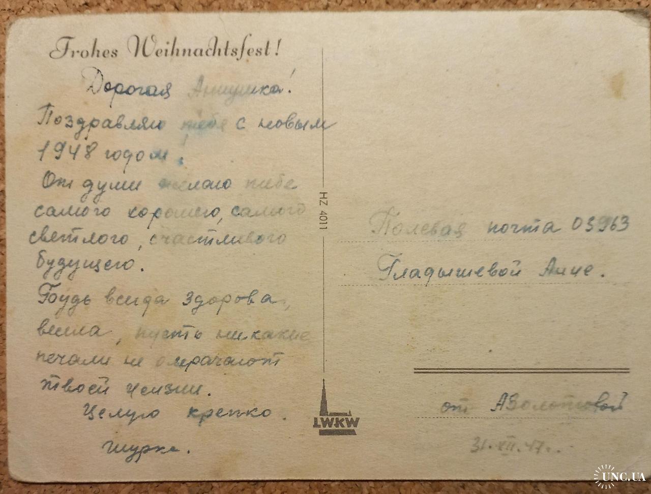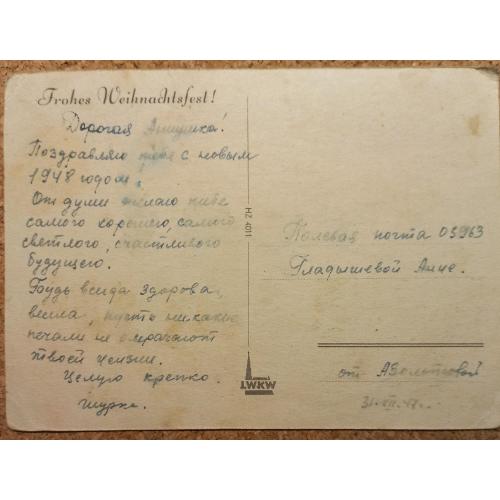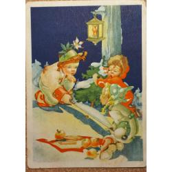 1941-1960Милые малыши и малышка развлекаются в Рождественскую ночь под сказочным фонарем. Открытка была переслана через советскую полевую почту, действующую в послевоенной Австрии. Год издания открытки принят условно. Он определен по дате подписи в письменном тексте. На самой открытке дата издания отсутствует, поэтому есть основание полагать, что год выпуска открытки может быть более ранним. Немного примяты уголки. Следы времени. Состояние открытки хорошее.