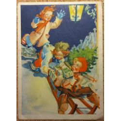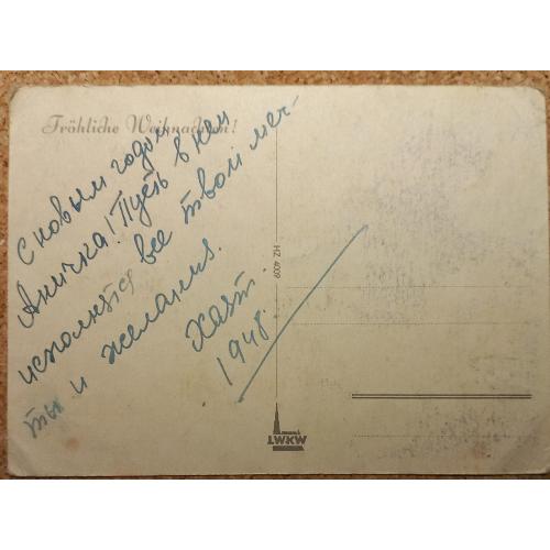 1941-1960Милые малыши и малышка развлекаются в Рождественскую ночь под сказочным фонарем. Год издания открытки принят условно. Он определен по дате подписи в письменном тексте. На самой открытке дата издания отсутствует, поэтому есть основание полагать, что год выпуска открытки может быть более ранним. Слегка примяты уголки. Следы времени. Состояние открытки хорошее.