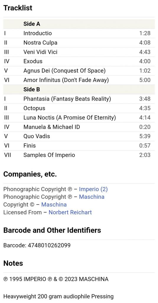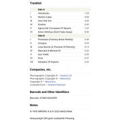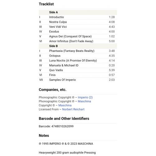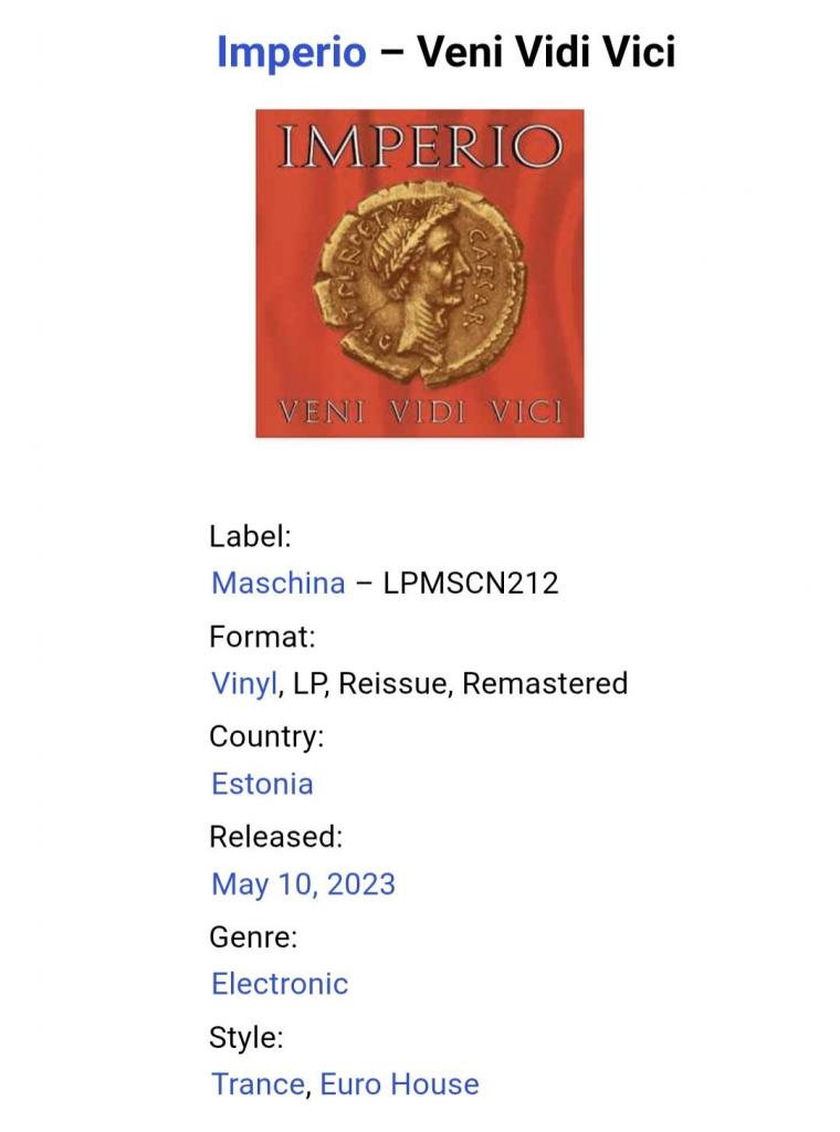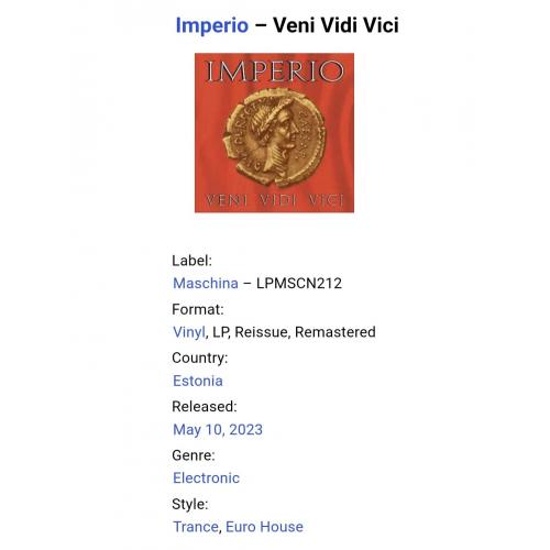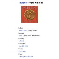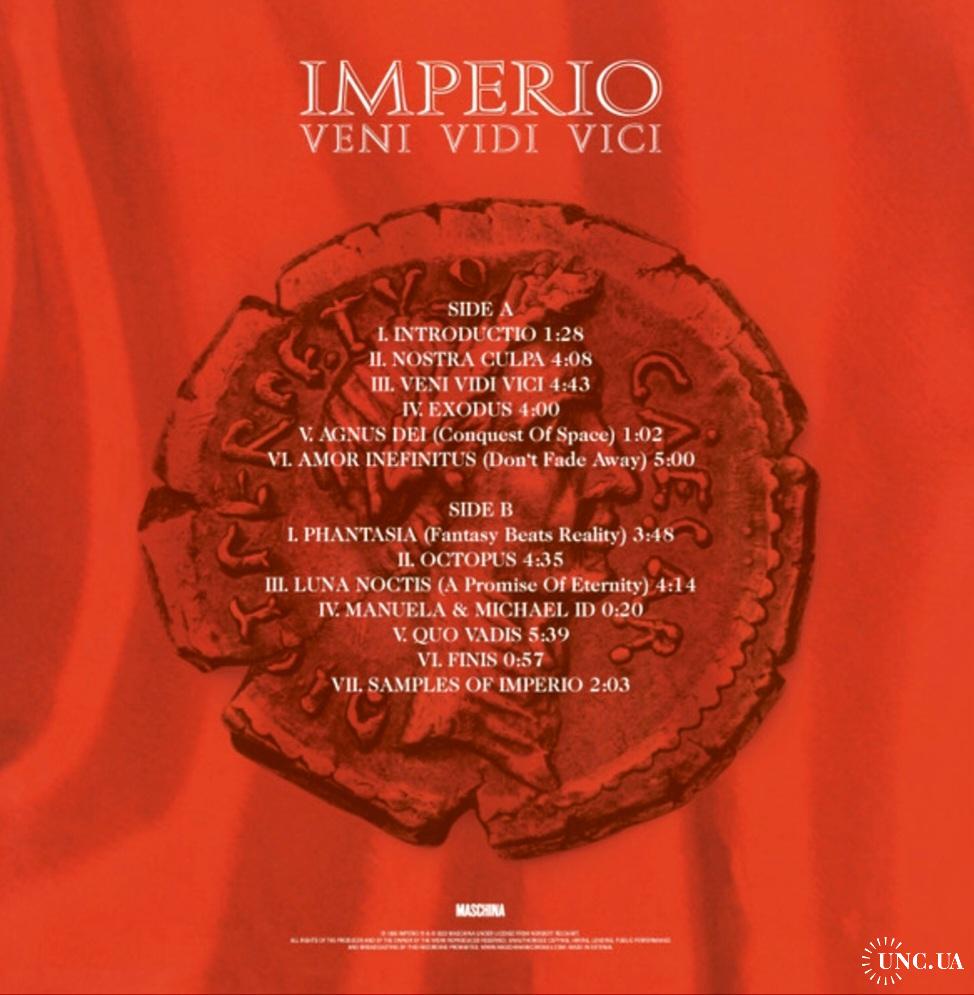 1981-2000Вінілова платівка. Перший, дебютний, в дискографії, студійний альбом, Австрійського євро денс, транс хаус проекту Imperio, який складався з учасників Мануели Рей та Майкла Харріса (Veni Vidi Vici) 1995. Випуск (Maschina) Estonia, 2023-ій рік. Лімітований тираж (Limited Edition). Видання нове, запаковане. Категорія S/S. Відправка по Україні службами доставки: Нова Пошта, Укр Пошта, Делівері. Також відправляємо посилки за кордон по цілому світу.
