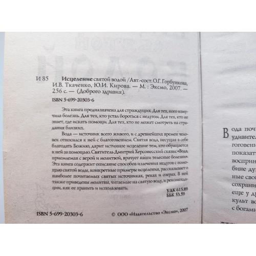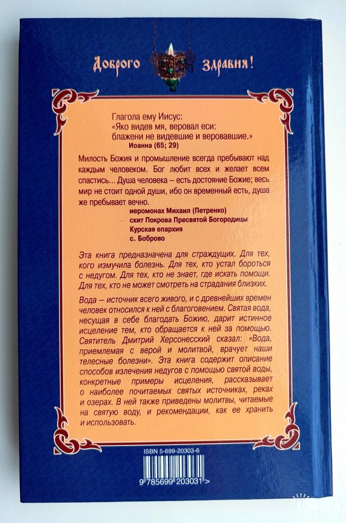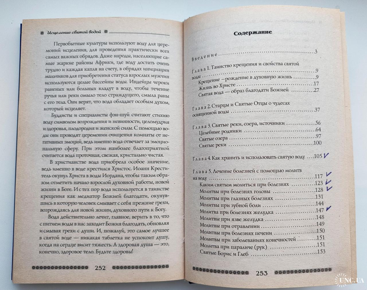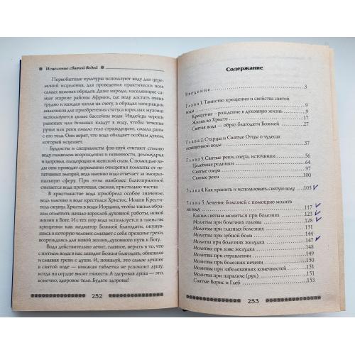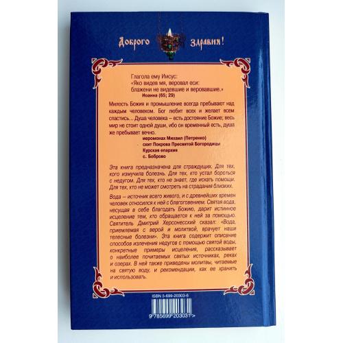 Эта книга содержит описание способов излечения недугов с помощью святой воды, конкретные примеры исцеления, рассказывает о наиболее почитаемых святых источниках, реках и озерах. В ней также приведены молитвы, читаемые на святую воду, и рекомендации, как ее хранить и использовать.