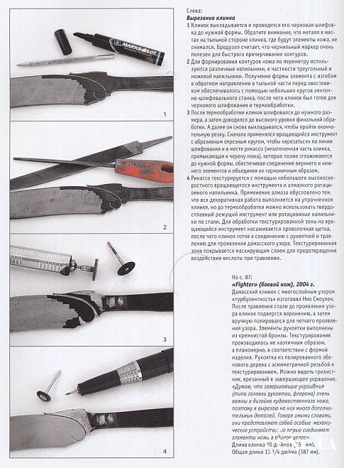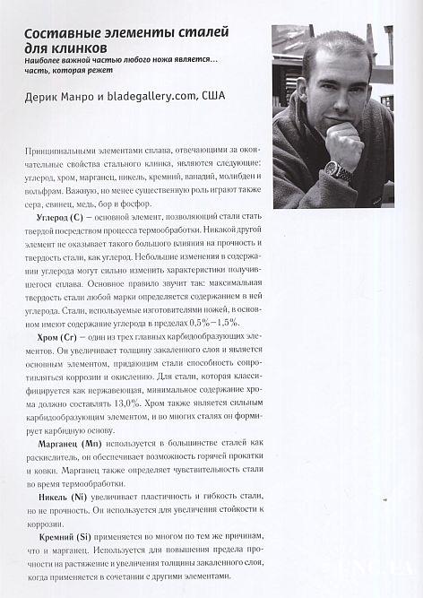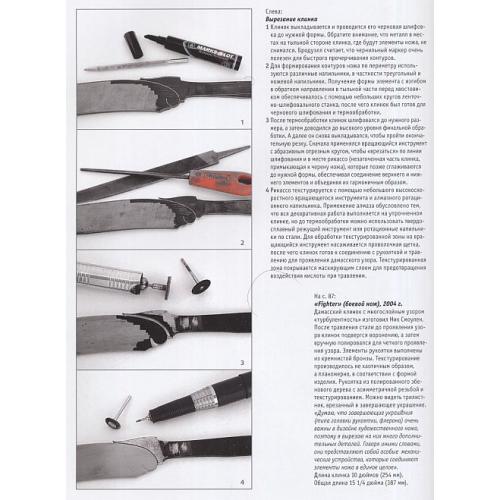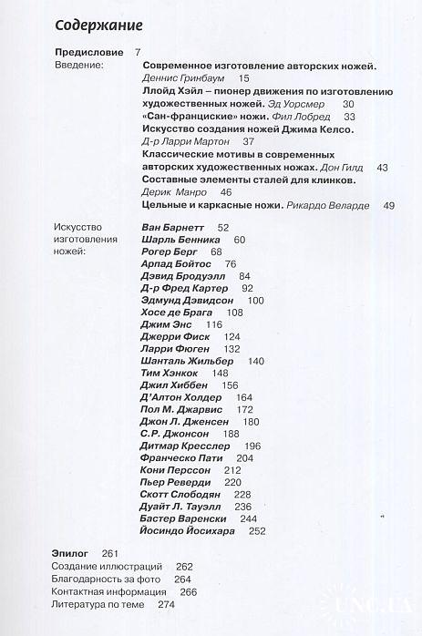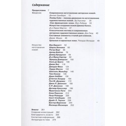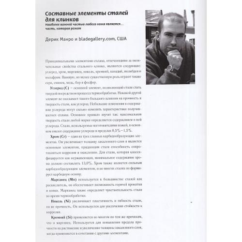 В этой книге каждому из 26 известных изготовителей ножей посвящены 8 страниц книги, где приводится следующая информация: - фотография художника и его биография; - серия фотографий, показывающая процесс создания определенных элементов ножа с неподвижным клинком; - полностраничная иллюстрация законченного авторского ножа; - на пяти страницах показаны отобранные авторские ножи, созданные художником в последние годы до ноября 2004 г.