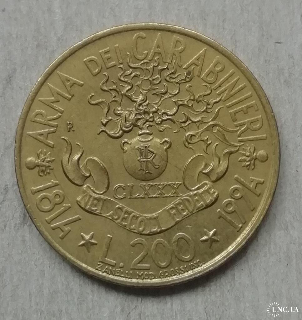 Италия 200 лир 1994 180 лет карабинерам
