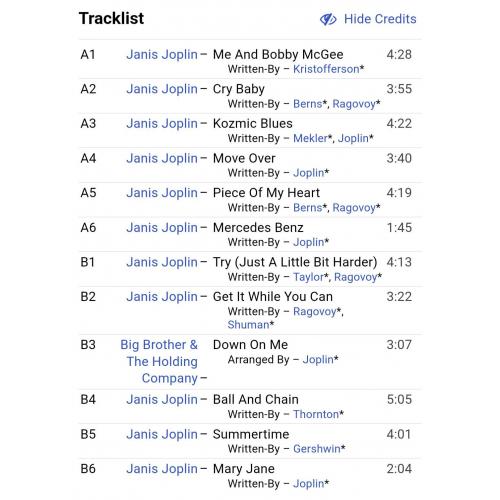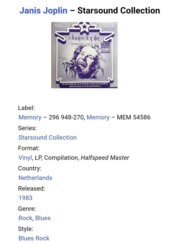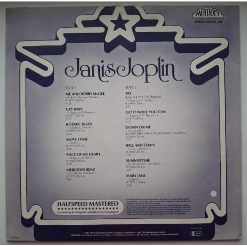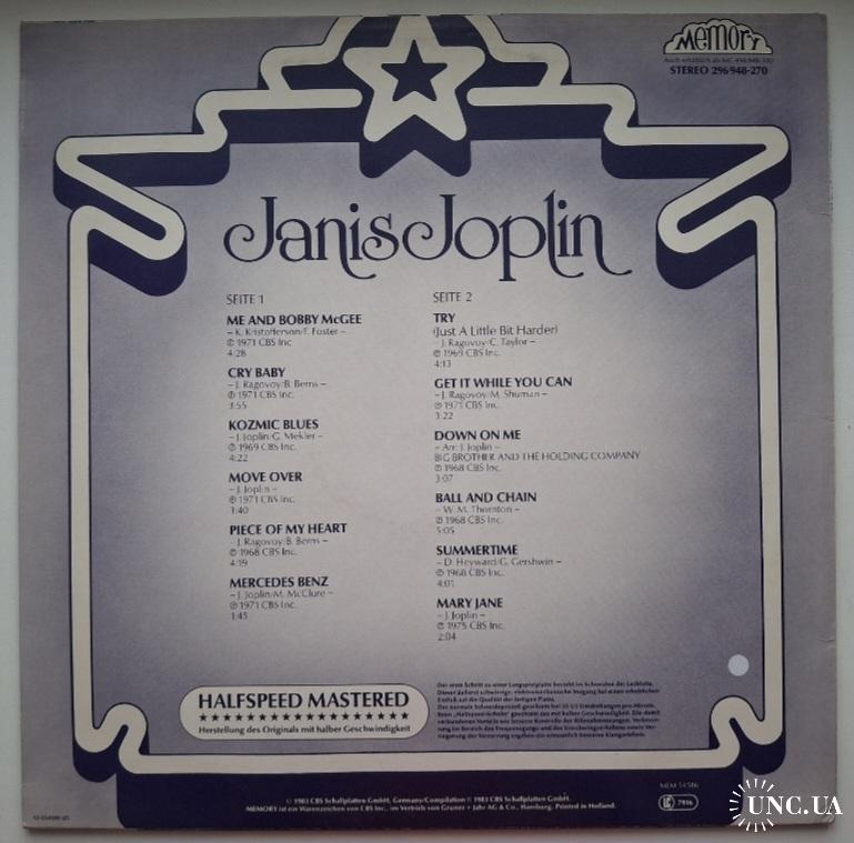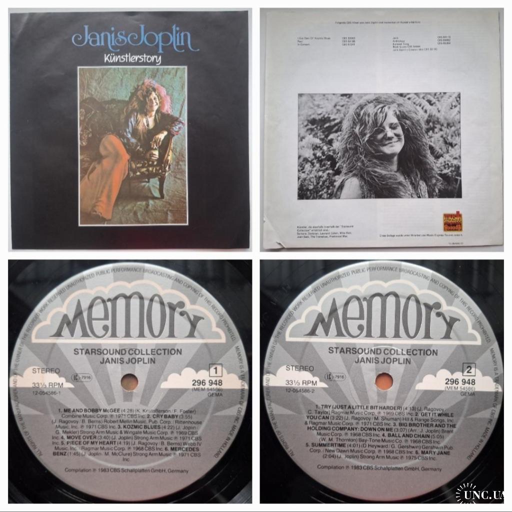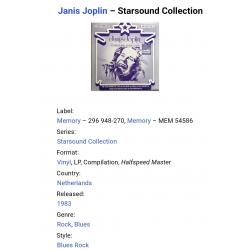 Вінілова платівка. Посмертна збірка найкращих хітів, Американської ейсід-рок, блюз-рок, психоделік-рок виконавиці, учасниці таких груп як Big Brother And The Holding Company, Kozmic Blues Band, та Full Tilt Boogie Band, покійної вже, Дженіс Лін Джоплін (Starsound Collection) 1968-70. Випуск фірми (Memory) Netherlands, 1983-ій рік. Оригінальне, першопресове, Голландське видання. Стан платівки EX+. Стан конверту EX+. В комплекті внутрішня, розворотна вставка. Відправка по Україні службами доставки: Нова Пошта, Укр Пошта, Делівері. Також відправляємо посилки за кордон по цілому світу.