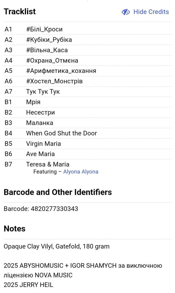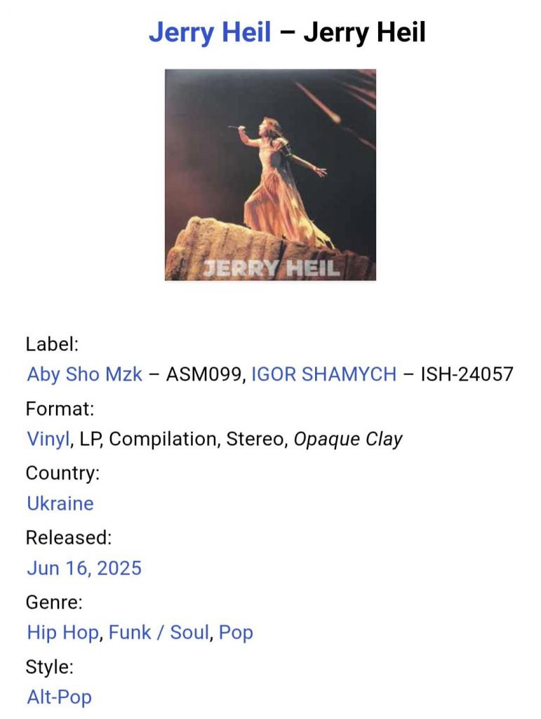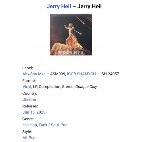 Вінілова платівка. Офіційна збірка найкращих хітів Української виконавиці стилів фанк соул, поп, хіп-хоп, Яни Шемаєвої, більше відомої під сценічним ім,ям Jerry Heil (The Best Of) 2017-2025. Випуск фірми (Aby Sho Mzk / Igor Shamych) Ukraine, 2025-ий рік. Кольоровий вініл (Coloured Vinyl). Лімітований тираж (Limited Edition). Нове, запаковане. Категорія S/S. Відправка по Україні службами доставки: Нова Пошта, Укр Пошта, Делівері. Також відправляємо посилки за кордон по цілому світу.