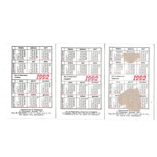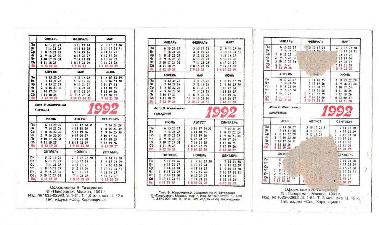 1981-2000Календарики 1992 Фауна, обезьяны.