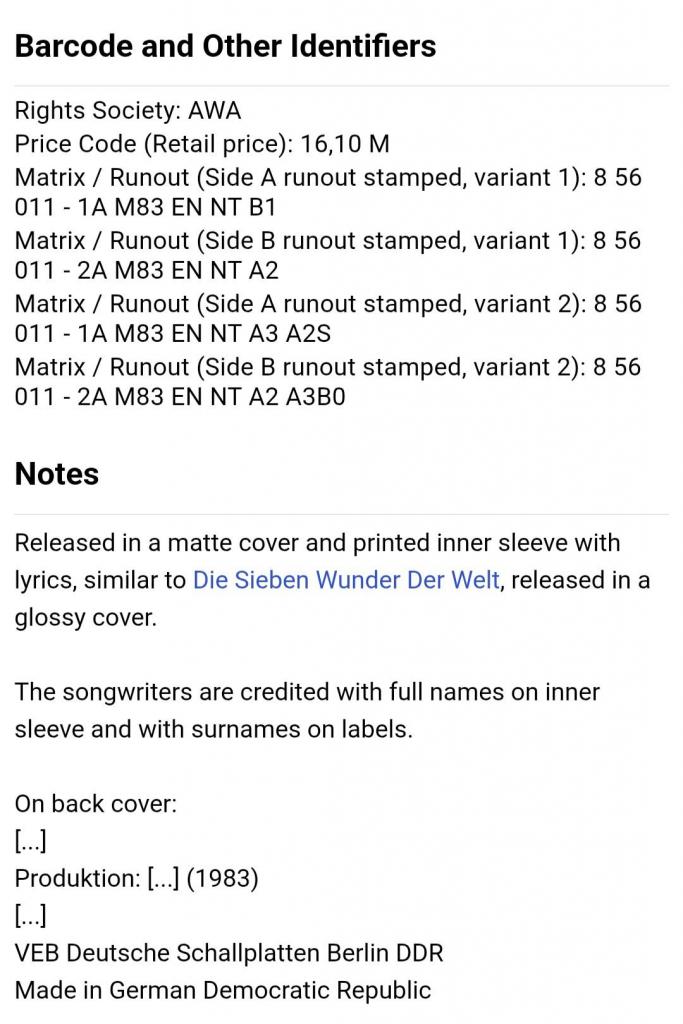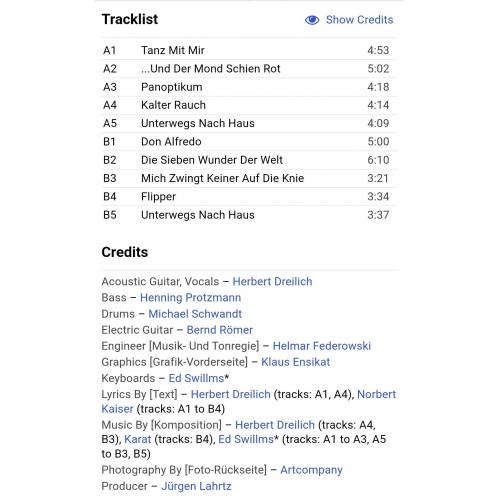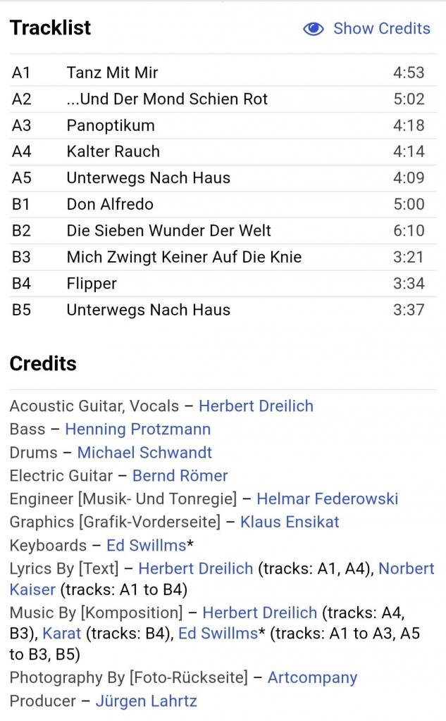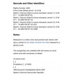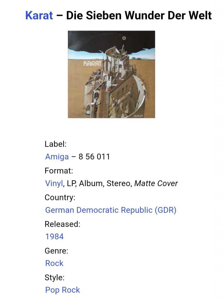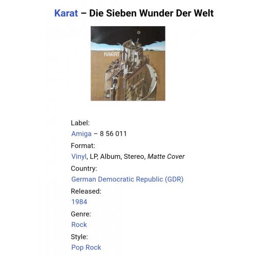 Вінілова платівка. Шостий, в дискографії, студійний альбом, Німецької поп-рок групи з Східного Берліну, Karat, до складу якого, на той час, входили Герберт Дрейліч, Хеннінг Протцманн, Бернд Ромер, Майкл Швендт, Ед Свіллмс, Томас Натшинські та Франк Людке (Die Sieben Wunder Der Welt) 1983. Випуск фірми (Amiga) DDR, 1984-ий рік. Оригінальне, рідне, Німецьке видання. Стан платівки EX+. Конверт глянцевий. Стан конверту EX+. Відправка по Україні службами доставки: Нова Пошта, Укр Пошта, Делівері. Також відправляємо посилки за кордон по цілому світу.