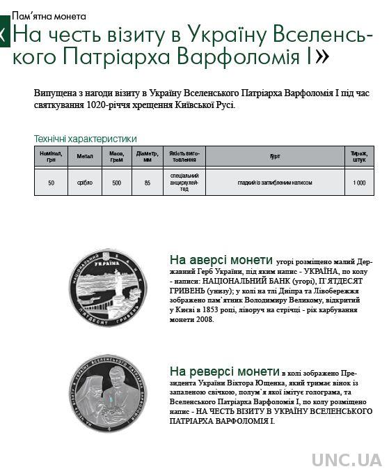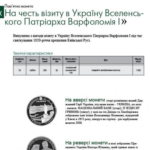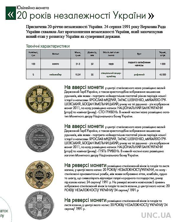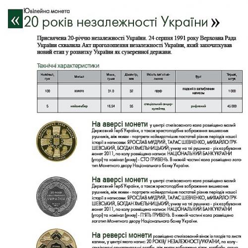 Первая юбилейная монета независимой Украины появилась 7 мая 1995г. Изготовленная из мельхиора, она была посвящена 50-летию Победы в Великой Отечественной войне. Первые золотые монеты Украины были введены в обращение в 1997 году.