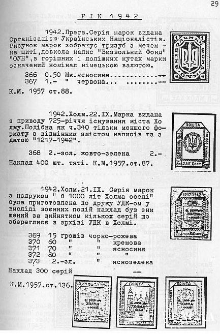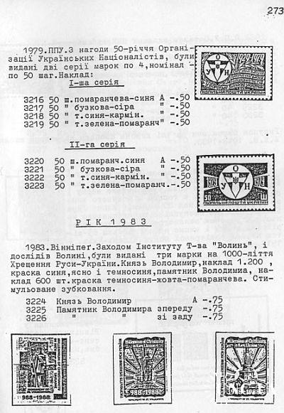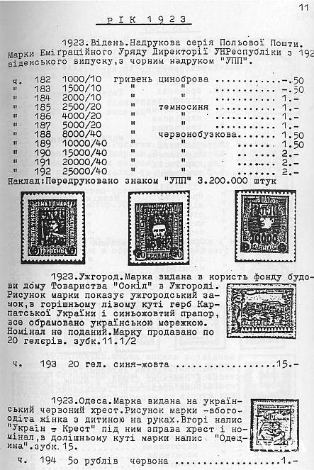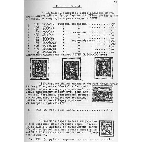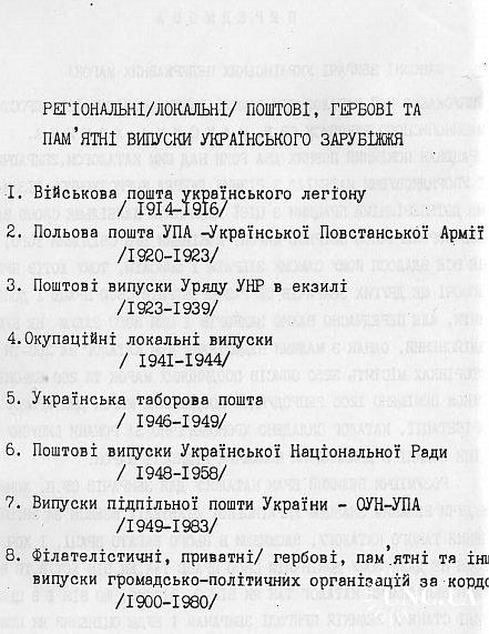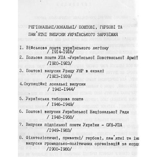 Наиболее полный каталог украинских негосударственных марок на украинском языке. Включает марки военной почты украинского легиона (1914-1918), полевой почты УПА (1920-1923), почтовые выпуски правительства УНР в изгнании (1923-1939), оккупационные локальные выпуски (1941-1944), марки украинской лагерной почты (1946-1949), почтовые выпуски Украинской Национальной Рады (1948-1958), выпуски Подпольной почты Украины (1949-1983), филателистические, частные, памятные и прочие выпуски общественно-политический организаций за рубежом (1900-1980)