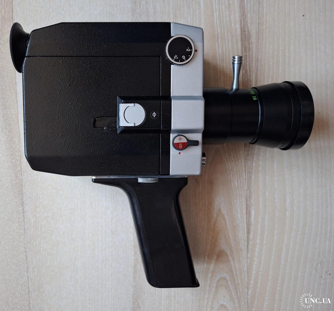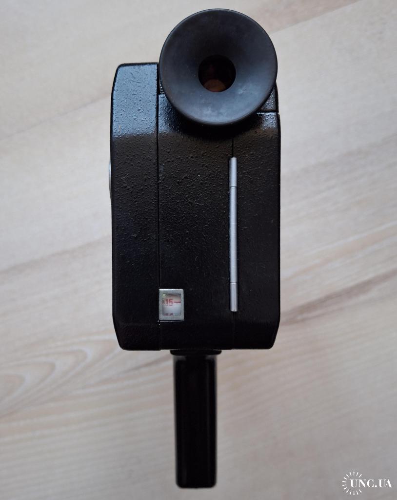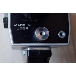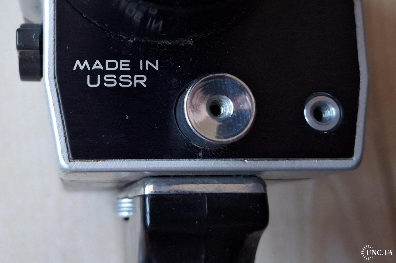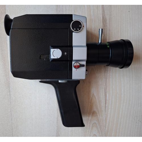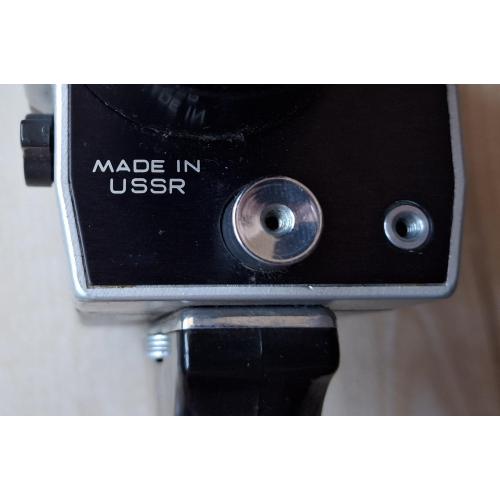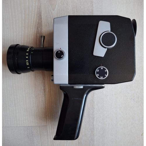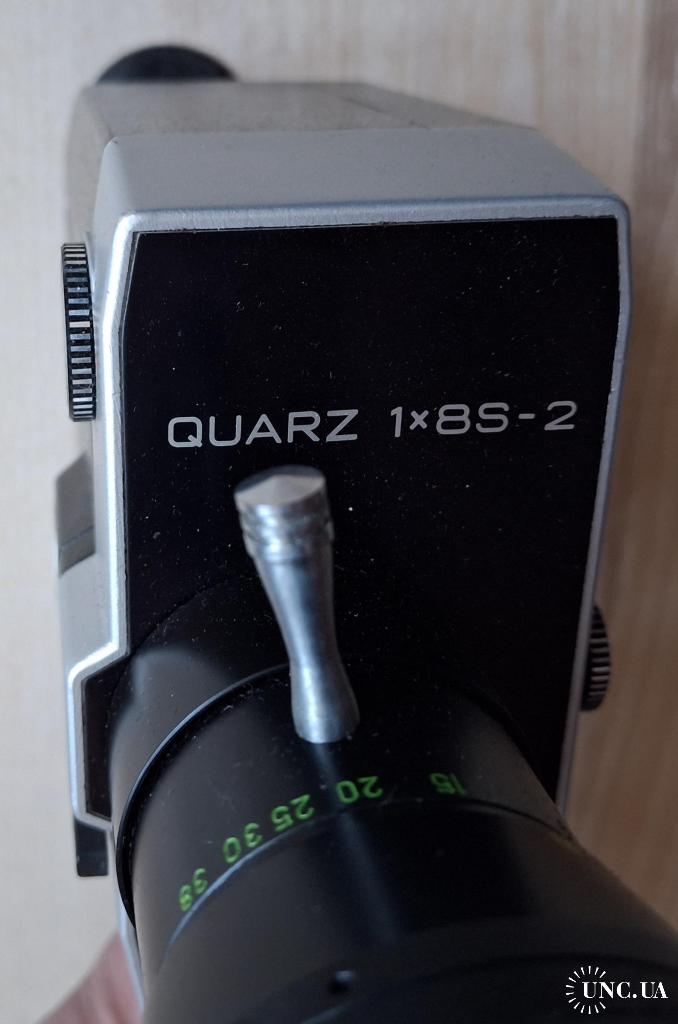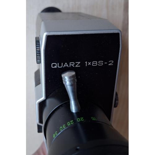 Советская любительская узкоплёночная кинокамера «Кварц 1×8С-2» с объективом «Метеор-8М-1». Производитель: Красногорский механический завод (КМЗ), СССР. Формат плёнки: Super 8. Пружинный привод, встроенный экспонометр (TTL).