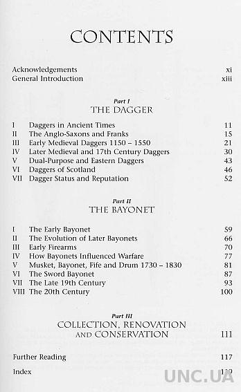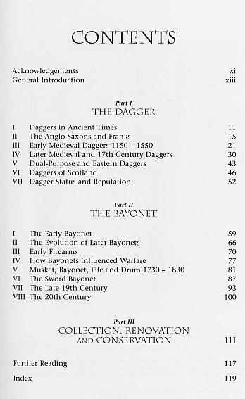 История, развитие и боевое применение штыка рассмотрены от ранних времен до 20-ого столетия. Одна глава посвящена исключительно тому, как накопить, восстановить и сохранять коллекцию оружия.