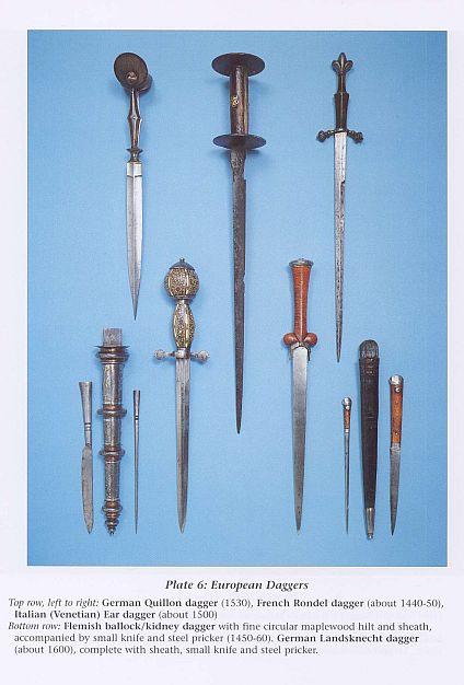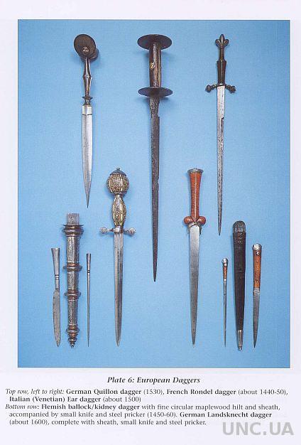 Все образцы кинжалов исследованы подробно, от прагматичного саксонского скрамасакса, используемого в битве при Гастингсе до щедро украшенных кинжалов Holbein позднего Ренессанса.