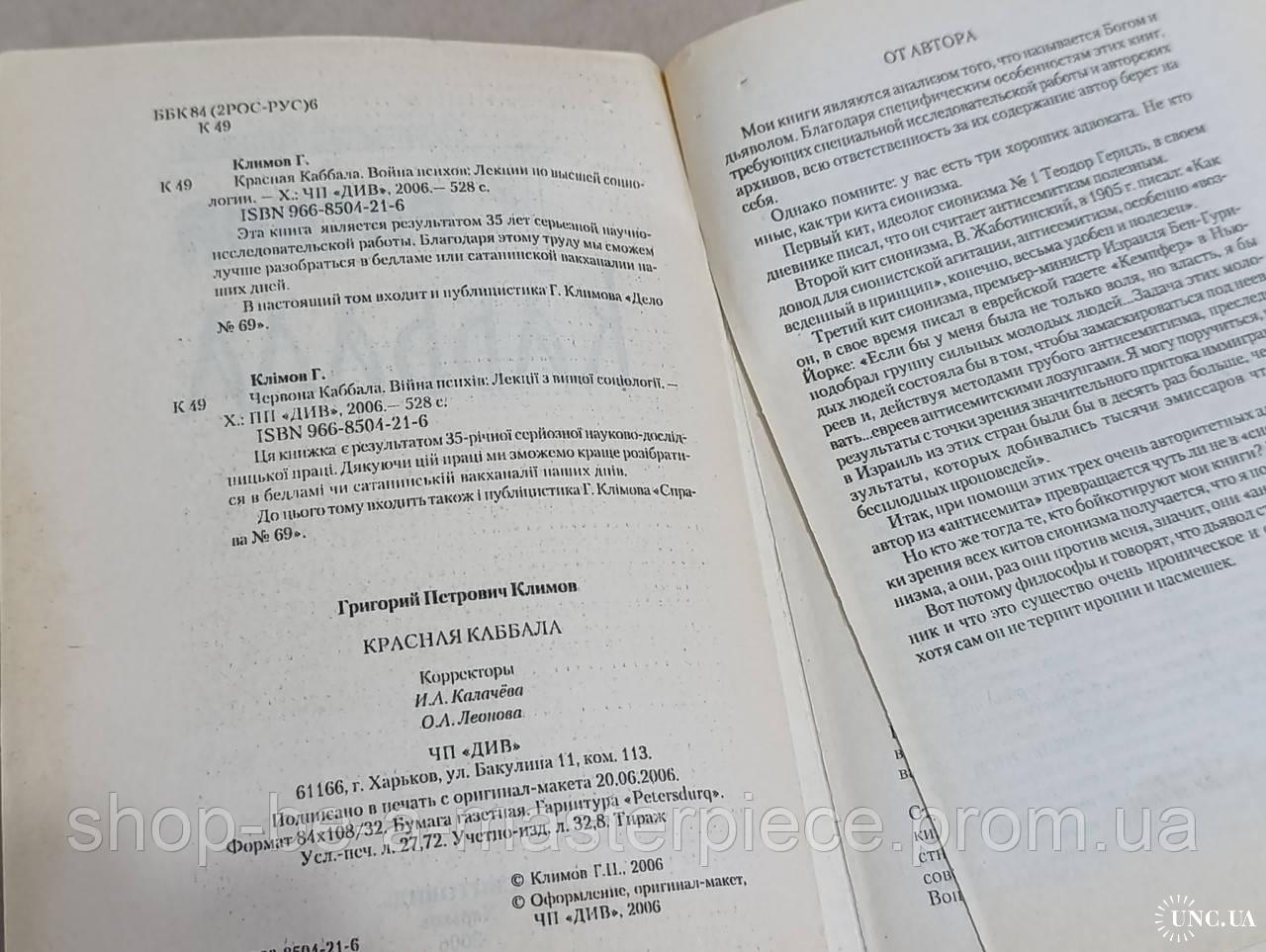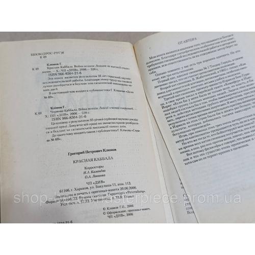 Климов Григорий Красная Каббала, Война психов: Лекции по высшей социологии 2006 Мягкая обложка, есть потертости Первая страничка в книге отклеивается 221 страница шире чем другие и имеет залом Х. ЧП «ДИВ». 2006. - 528 с. Эта книга является результатом 35 лет серьезной научно-исследовательской работы. Благодаря этому труду мы сможем лучше разобраться в бедламе или сатанинской вакханалии на них дней. В настоящий том входит и публицистика Г. Климиина «Дело № 69.Відповіді продавця на ваші питання
