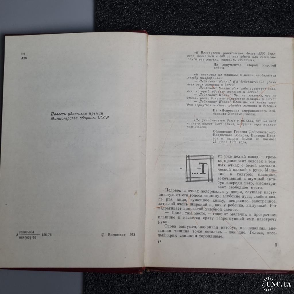 Автобус мирно котить по польовій дорозі. Пасажири зайняті розмовами. Ось із-за повороту показалося село. Широка вулиця. Берези, клени. Будинків поки не видно, лише рідкісні купи колод, винесені за палісадник, ближче до сусіднього будинку. Там, де мали б стояти будинки, — обеліски, обеліски, обеліски. Це — пам'ятники мешканцям білоруських сіл, знищених карателями.