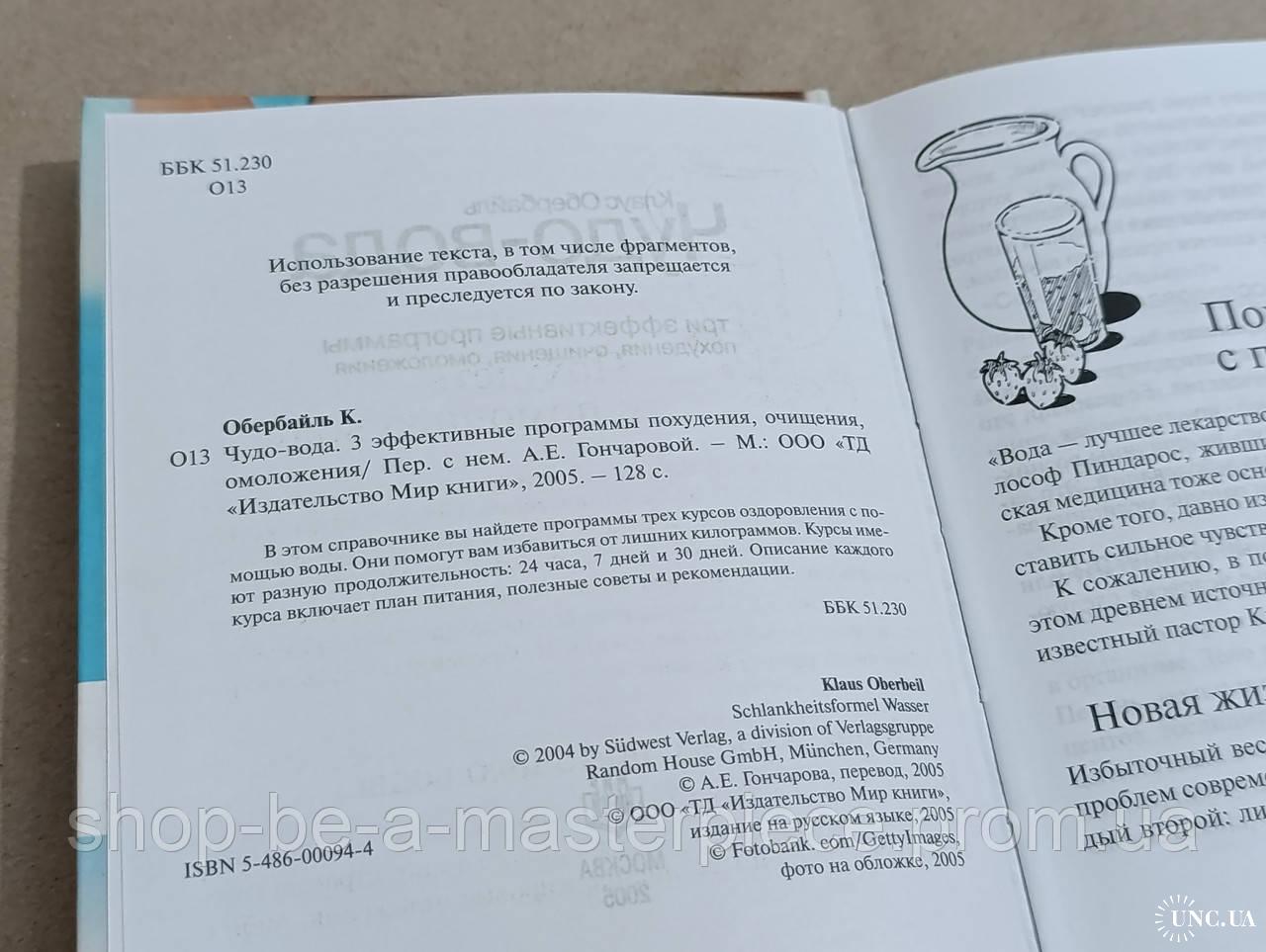 Книга Обербайль К. Чудо-вода. 3 эффективные программы похудения, очищения, омоложения В продаже есть еше книги о здоровье Обербайль К. Чудо-вода. 3 эффективные программы похудения, очищения, омоложения/ Пер. с нем. А.Е. Гончаровой. «Издательство Мир книги», 2005. – 128 с. Твердая обложкаВідповіді продавця на ваші питання