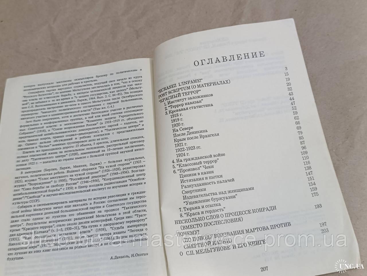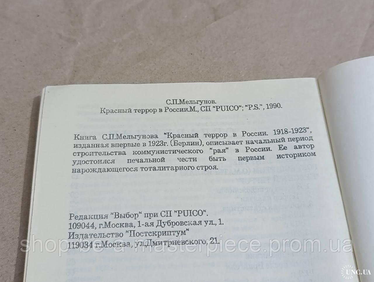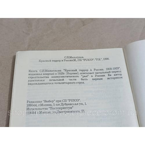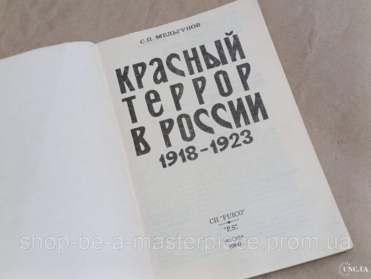 С.П. МЕЛЬГУНОВ Красный террор В РОССИИ 1918-1923, 1990 Мягкая обложка . 207 стр Есть надрыв на боковой части обложки , слегка порыжели страницы CII "PUICO" "P.S. MOCKBA 1990 Книга С.П.Мелгунова "Красный террор в России. 1918-1923", изданная впервые в 1923г. (Берлин), описывает начальный период строительства коммунистического "рая" в России. Ее автор удостоился печальной чести быть нарождающегося тоталитарного строя. первым историкомВідповіді продавця на ваші питання