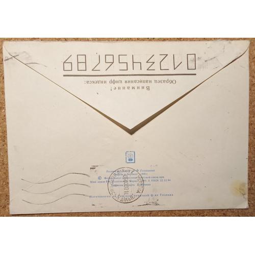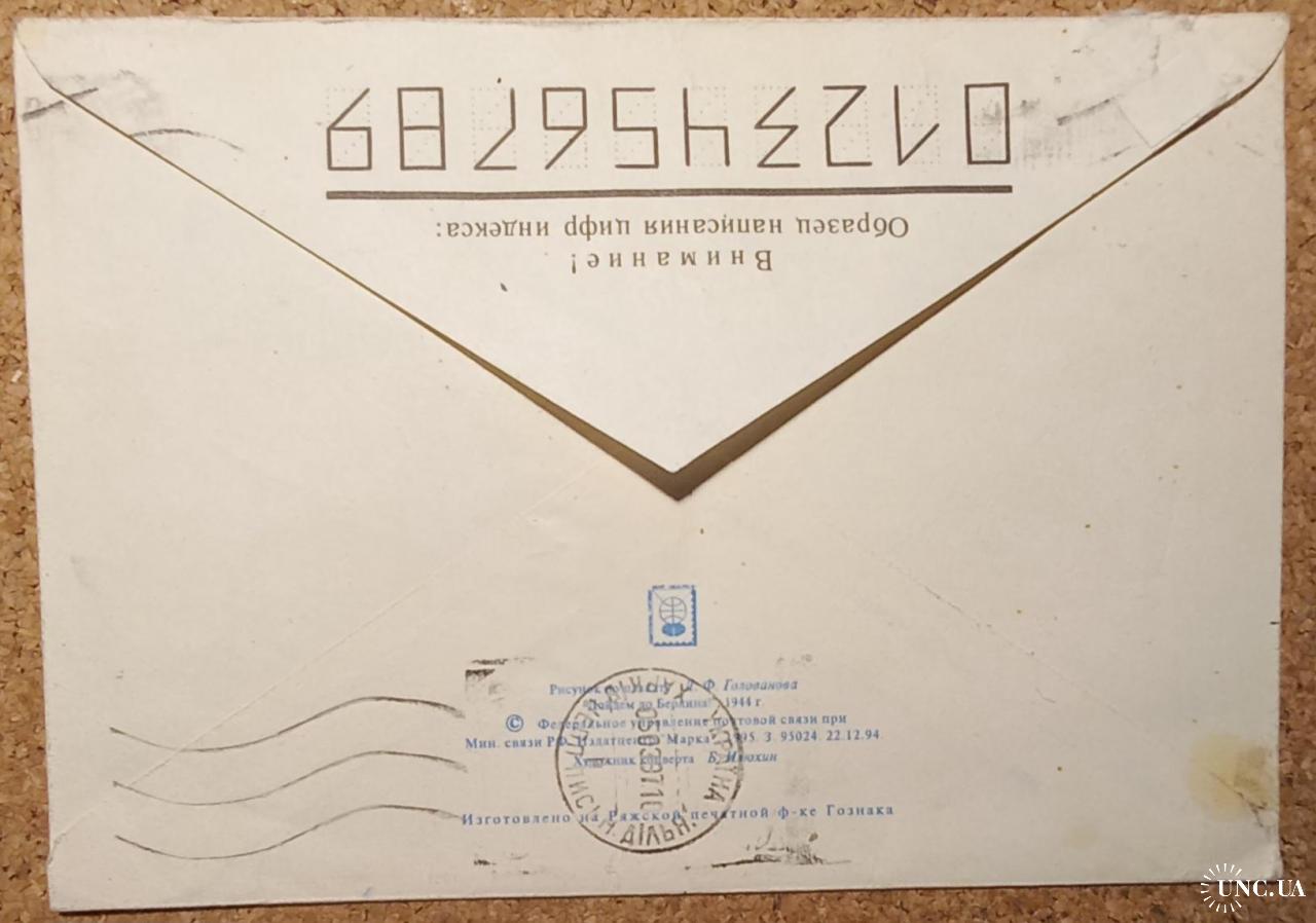 ПропагандаРисунок по плакату Л.Ф. Голованова «Дойдем до Берлина!», 1944 г. Федеральное управление почтовой связи при Минсвязи РФ. Изд-во«Марка».1995.Реальный полученный конверт моей мамой, участницей ВОВ, от однополчанки. Имеется небольшой дефект в виде надрыва косынки на обратной стороне конверта. Разрыв заклеен. Состояние конверта хорошее. P.S. Можно обратить внимание, что в этом году в Украине еще действовала 6-значная почтовая индексация, которая существовала при СССР.