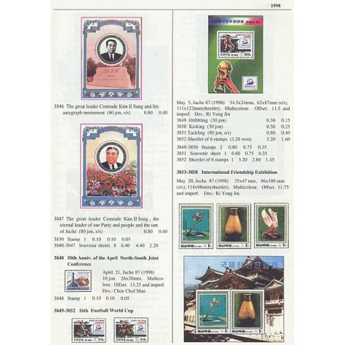Цветной корейский каталог почтовых марок (1946-1998) является последним корейским каталогом почтовых марок, выпущенным в Чучхе 82 (1993) в соответствии с растущими требованиями дилеров почтовых марок и филателистов. Сегодня корейские почтовые марки богаты в содержании дизайна, высокого уровня художественного качества. Расширен тематический выпуск, как по стране, так и за границей. Настоящий каталог включает более чем 3800 марок, выпущенных в КНДР от первых марок “Rose of Sharon” и “Samson Rock”, вышедших 12 марта, Чучхе 35 (1946) до марок, выпущенных в июне, Чучхе 87 (1998).