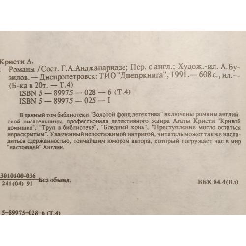 Кристи. Кривой домишко. Труп в библиотеке. Бледный конь. Преступление могло остаться не раскрытым. Серия ЗФД том 4 син. Издательство: Днепркнига 1991 год. Очень хорошее состояние