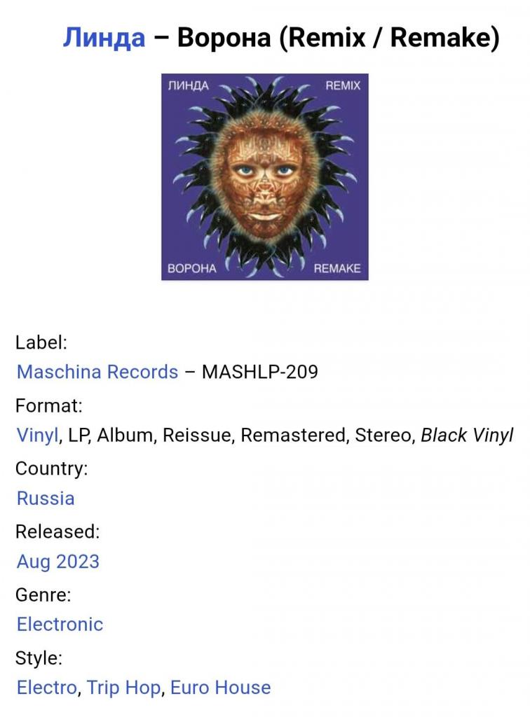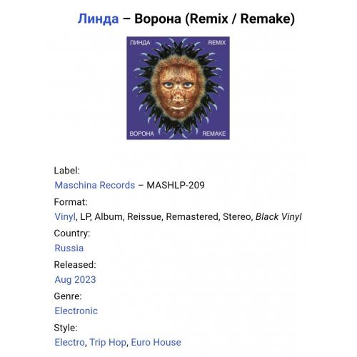 Вінілова платівка. Другий, в дискографії, студійний, альбом реміксів, Казахської (російської) виконавиці стилів інді-рок, тріп-рок, електро поп, нью ейдж, готік рок, Світлани Гейман, більше відомої під сценічним ім,ям Лінда (Ворона. Remix & Remake) 1997. Випуск фірми (Maschina Records) Estonia, 2023-ій рік. Лімітований тираж (Limited Edition). Видання нове, запаковане. Категорія S/S. Відправка по Україні службами доставки: Нова Пошта, Укр Пошта, Делівері. Також відправляємо посилки за кордон по цілому світу.