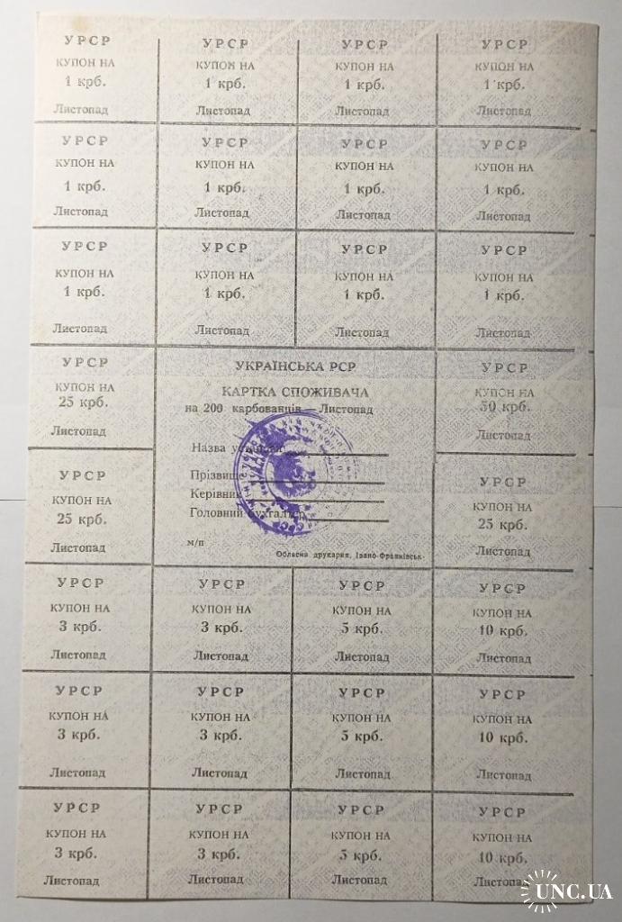 Лист купонів. Картка споживача. Карточка потребителя. Лист купонов. 200.