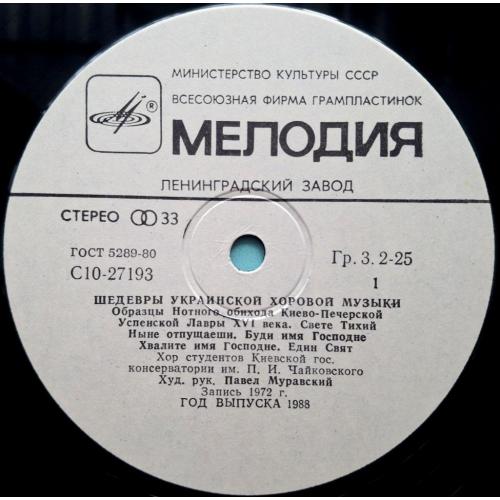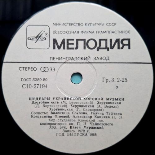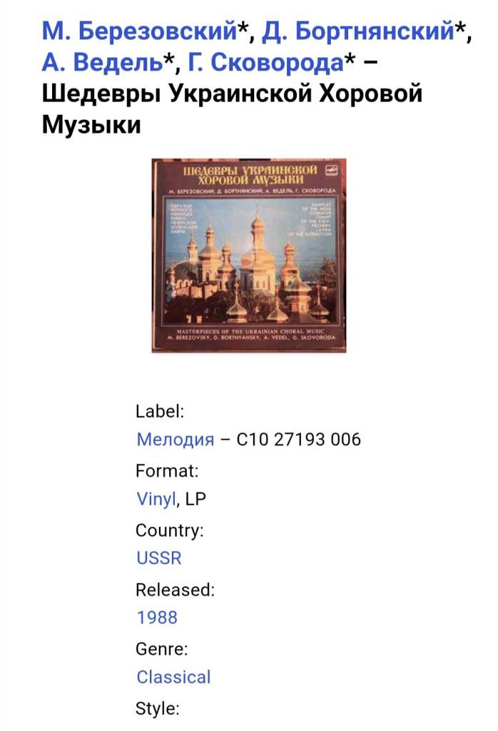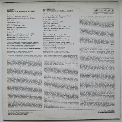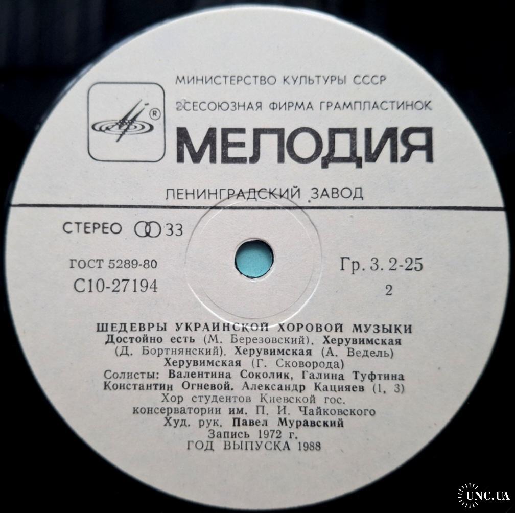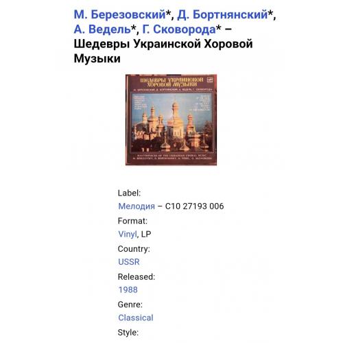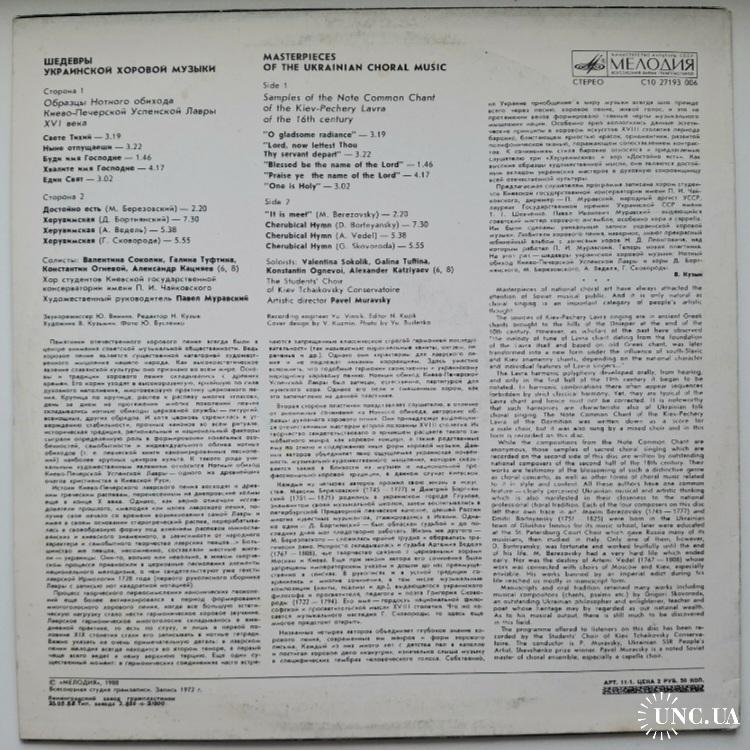 Вінілова платівка. Студійний альбом Українського хору студентів Київської Державної консерваторії імені Павла Чайковського, солістами якого були Валентина Соколик, Галина Туфтіна, Костянтин Огневий, Олександр Кацияєв, на твори М. Березовського, Д. Бортянського, А. Веделя та Г. Сковороди (Шедеври Української Хорової Музики. Образці Нотного обиходу Києво-Печерської Успенської Лаври XVI сторіччя) 1972. Випуск фірми (Мелодія) СРСР, Ленінградський завод грамплатівок, 1988-ий рік. Оригінальне, першопресове видання. Рідкісне (Rare). Стан платівки NM. Стан конверту ЕХ+. Відправка по Україні службами доставки: Нова Пошта, Укр Пошта, Делівері. Також відправляємо посилки за кордон по цілому світу.