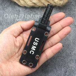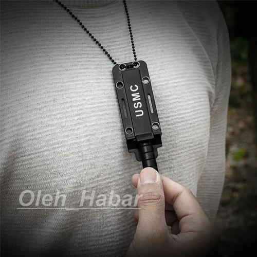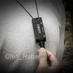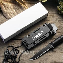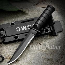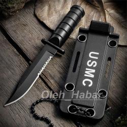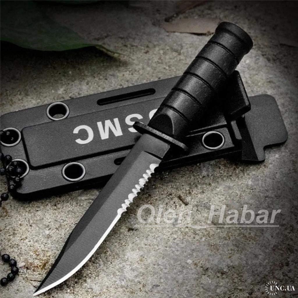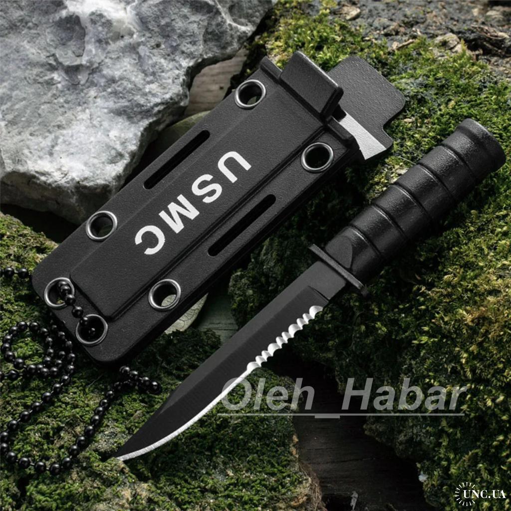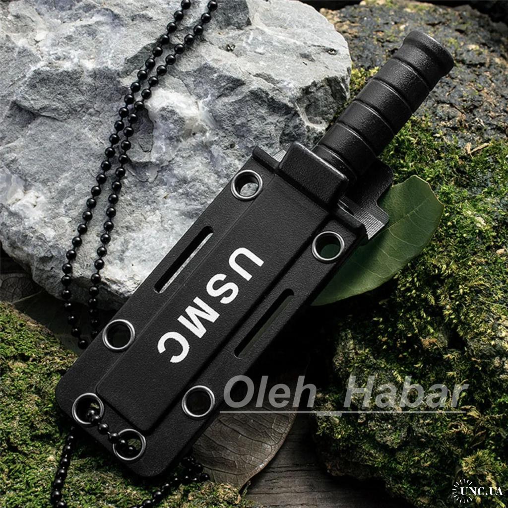 Зменшена копія знаменитого бойового ножа в комплекті з пластиковими ножнами на довгому ланцюжку, який можна повісити на шию. Пластикова рукоять, лезо з нержавіючої сталі із чорним покриттям. Ніж фіксується в ножнах і не випадає з них при трясці. Незважаючи на свої розміри, ніж цілком гострий та ріжучий