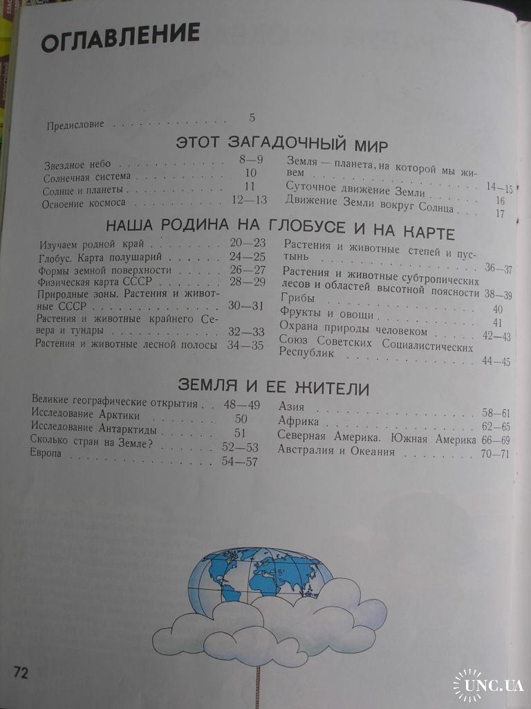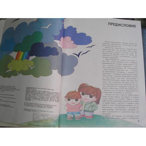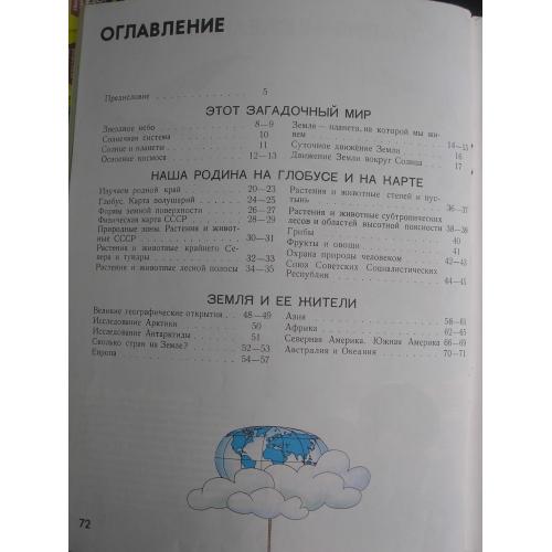 Познавательное красочно оформленное издание с прекрасной полиграфией. Среди разделов: Звездное небо, Солнечная система, Суточное движение Земли, Движение Земли вокруг Солнца, Освоение космоса, Наша Родина на глобусе и на карте (в т. ч. физическая карта, природные зоны и их растения и животные, ), Земля и ее жители ( в том числе географические и природные карты частей Света), Великие географические открытия и др. В подготовке и оформлении издания участвовал большой коллектив авторов.