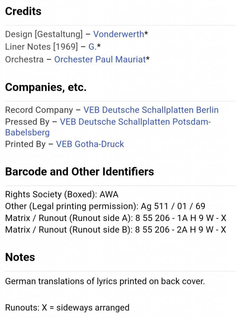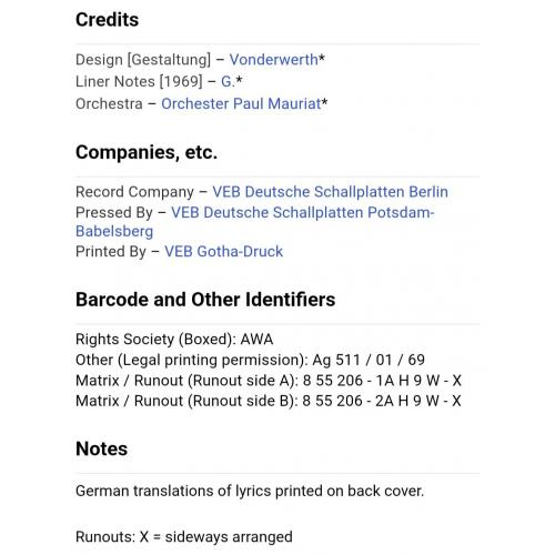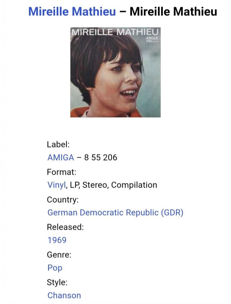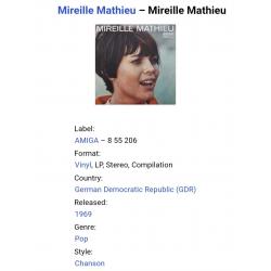 1961-1980Вінілова платівка. Офіційна збірка найкращих ранніх хітів, легендарної Французької поп, шансон виконавиці Мірей Матьє (Greatest Hits) 1966-69. Випуск фірми (Amiga) GDR, 1969-ий рік. Оригінальне Німецьке видання. Стан платівки ЕХ+. Стан конверту ЕХ+. Відправка по Україні службами доставки: Нова Пошта, Укр Пошта, Делівері. Також відправляємо посилки за кордон по цілому світу.