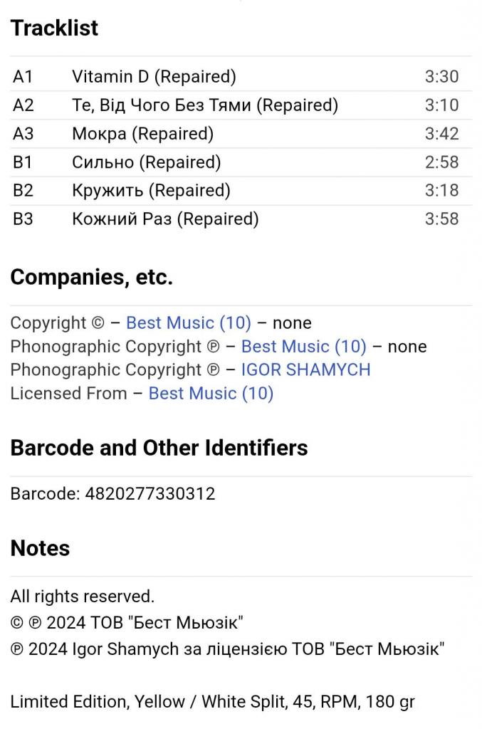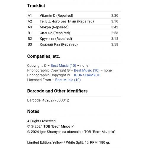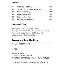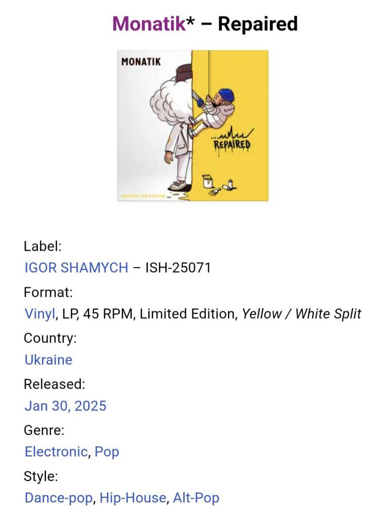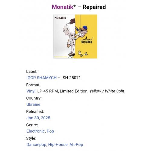 Вінілова платівка. Студійний міні альбом, який являє собою переосмислену та стилістично оновлену версію відомих треків, Українського виконавця стилів хіп-хоп, джаз-фанк соул, ритм енд блюз, Дмитра Монатика, більше відомого під скороченим ім,ям Monatik (Repaired) 2024. Випуск фірми (Aby Sho Mzk / Igor Shamych) Ukraine, 2025-ий рік. Оригінальне, першопресове видання. Кольоровий вініл (Coloured Vinyl). Лімітований тираж (Limited Edition). Нове, запаковане. Категорія S/S. Відправка по Україні службами доставки: Нова Пошта, Укр Пошта, Делівері. Також відправляємо посилки за кордон по цілому світу.