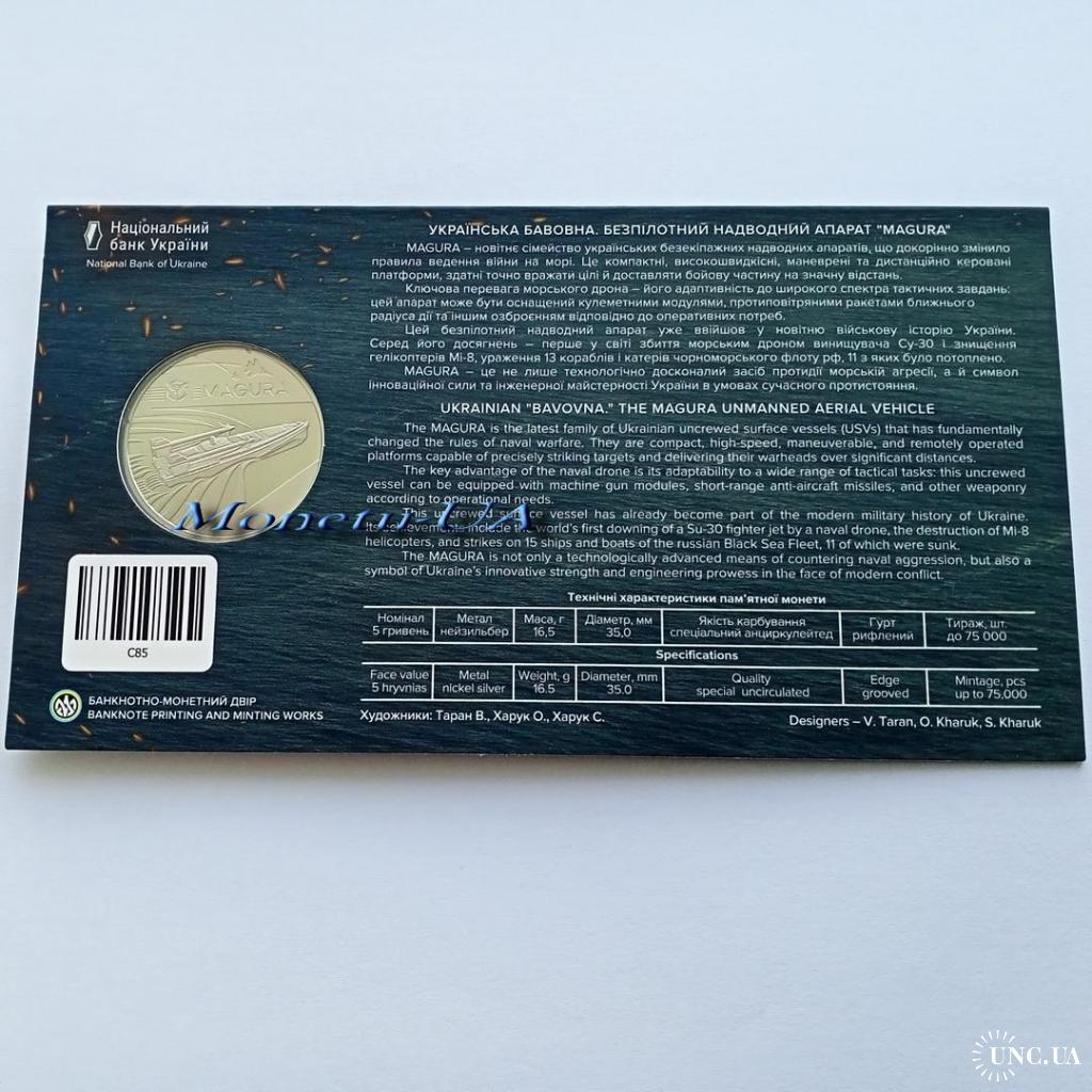 Пам'ятна монета "Українська бавовна. Безпілотний надводний апарат "Magura"" 2025 рік / Україна / НБУ / в сувенірній упаковці / буклет / ЗСУ / Магура