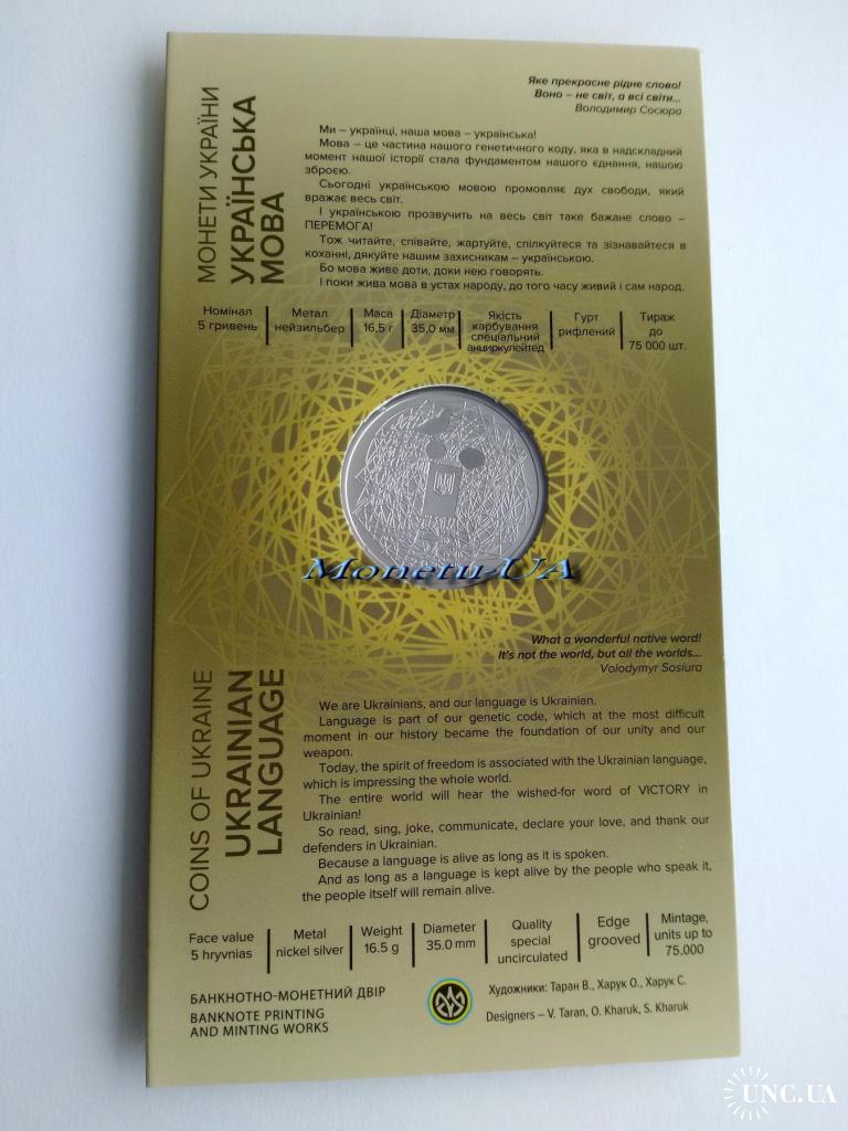 Пам`ятна монета присвячена українській мові. Мова – не лише засіб спілкування, але й носій багатої культурної спадщини, це частина нашого генетичного коду. Саме мова в надскладний момент історії України стала фундаментом нашого єднання, нашою зброєю. Сьогодні українською мовою промовляє дух свободи, який вражає весь світ.
