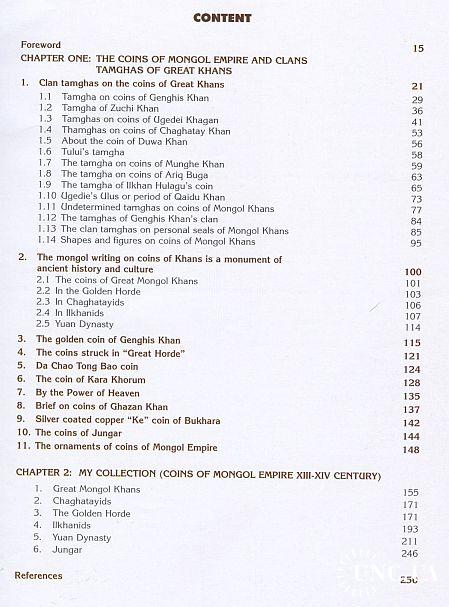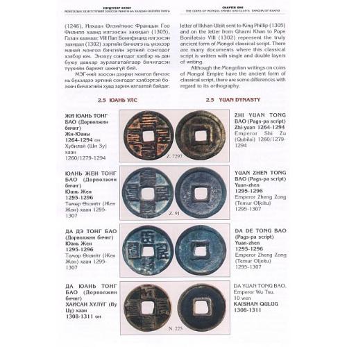 Редкая, прекрасно изданная книга по нумизматике. Подробное описание монет и тамга ханских кланов монгольской империи и монгольской династии Юань, правящей в Китае в 13-14вв. Большое количество цветных иллюстраций. Глубокая проработка типов и разновидностей монет и тамга, их систематизация. Приводится перевод с древнемонгольского и древнекитайского на английский язык легенд монет и других надписей, их пояснение.