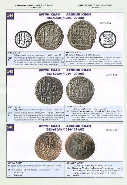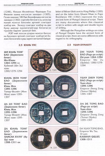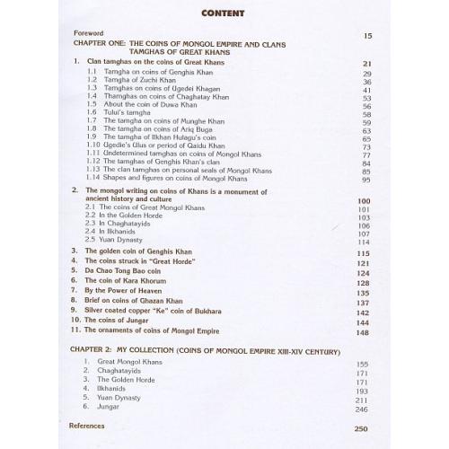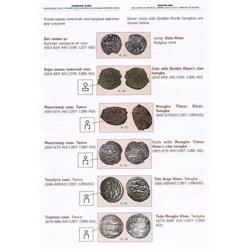 Редкая, прекрасно изданная книга по нумизматике. Подробное описание монет и тамга ханских кланов монгольской империи и монгольской династии Юань, правящей в Китае в 13-14вв. Большое количество цветных иллюстраций. Глубокая проработка типов и разновидностей монет и тамга, их систематизация. Приводится перевод с древнемонгольского и древнекитайского на английский язык легенд монет и других надписей, их пояснение.