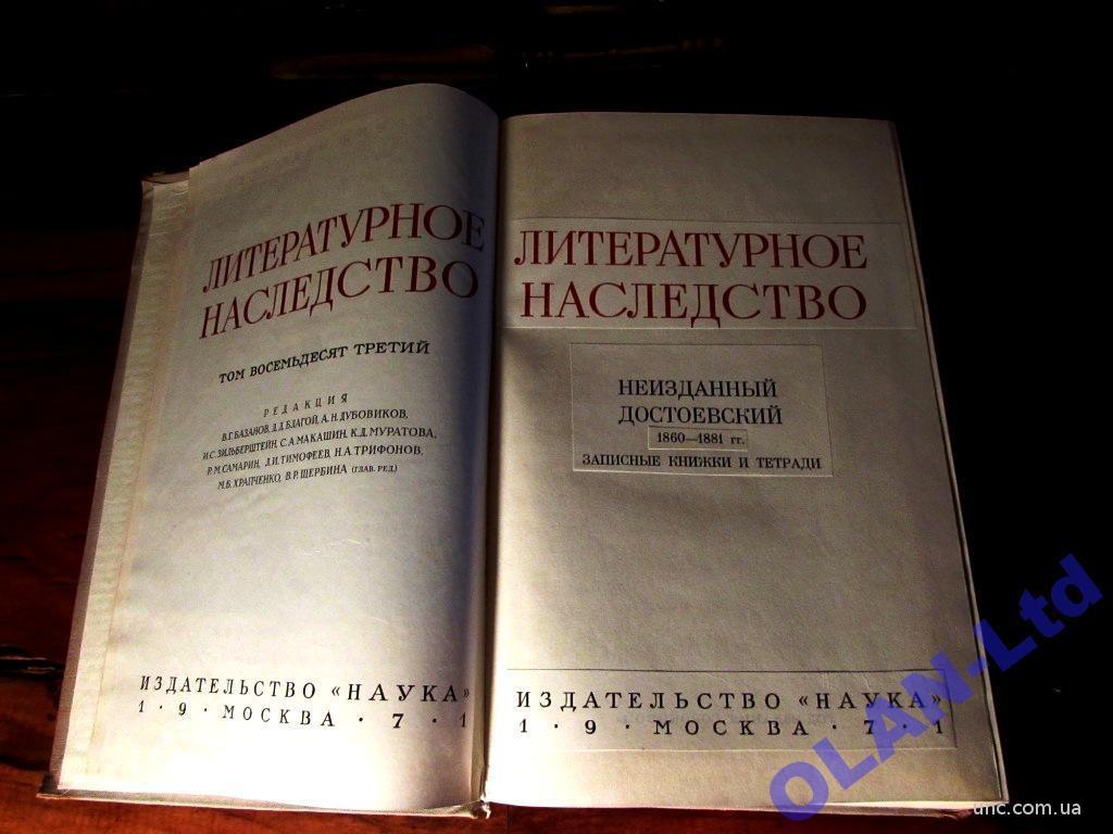Академическое букинистическое иллюстрированное серийное издание Жанр: Биографии и мемуары, Литературоведение Серия: «Литературное наследство», том 83. АКАДЕМИЯ НАУК СССРИнститут мировой литературыим. А. М. Горького.Неизданный Достоевский:Записные книжкии тетради (1860—1881 гг.).Москва, 1971 г. Издательство: «Наука». Редакторы тома : И. С. Зильберштейн и Л. М. Розенблюм. Редакция: В. Базанов, Д. Благой, А. Дубовиков, И. Зильберштейн, С. Макашин, К. Муратова, Р. Самарин, Л. Тимофеев, Н. Трифонов, М. Храпченко, В. Щербина (главный редактор). С 95 иллюстрациями и портретом Ф.М.Достоевского на фронтисписе ( репродукция работы В.Г.Перова, 1872 г.)! С именным указателем, с указателем упоминаемых произведений Достоевского! Обьем : 728 стр. Увеличенный формат : 26 , 6 x 18 х 3,5 см Тираж незначительный : 15 000 экз. Переплет :Твердый издательский тканевый переплет с тиснением позолотой названия книги и тиснением названия издательства и года издания на корешке. Сохранность: Очень хорошая. Книга без утрат.Также сохранились все 95 иллюстраций ( гравюры, рисунки, карикатуры, литографии, фотографии, автографы и портреты писателя, его семьи и окружения, обложки и титулы его произведений, иллюстрации к произведениям Достоевского, изображения памятных мест ) . Следы времени, легкая потертость уголков переплета. Книга без библиотечных печатей действующих госбиблиотек и без дарственных надписей! Данный экземпляр будет особенно интересным для коллекционеров-библиофилов: на титулах сохранился автентичный оттиск редкой круглой гербовой печати – оригинального экслибриса первого владельца – с изображением королевской лилии в обрамлении короны и с владельческой надписью: «Ex Libris Andrew Kandya». Этот художественный экслибрис в стиле барокко в узкой среде настоящих книголюбов имеет коллекционную ценность, ведь уже давно стал символом знака качества антикварных и букинистических изданий не только в Украине, но и во многих зарубежных странах. |