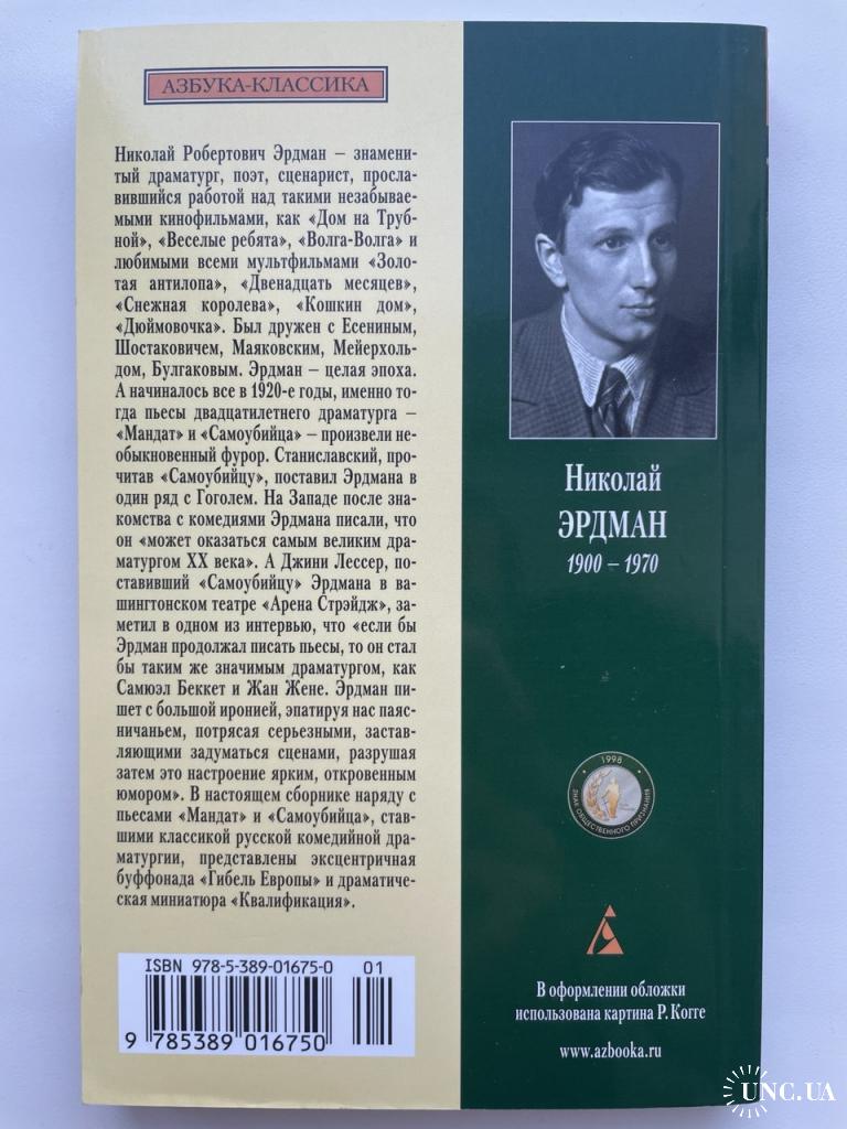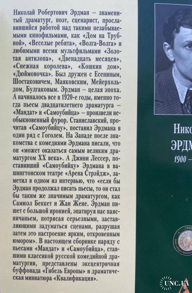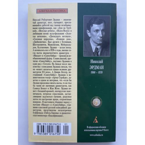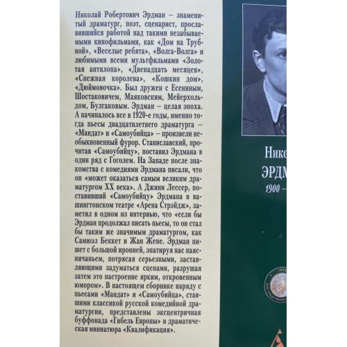 Николай Робертович Эрдман — знаменитый драматург, поэт и сценарист, известный работами над фильмами «Дом на Трубной», «Весёлые ребята», «Волга-Волга» и любимыми мультфильмами «Золотая антилопа», «Двенадцать месяцев», «Снежная королева», «Кошкин дом», «Дюймовочка». Он дружил с Есениным, Шостаковичем, Маяковским, Мейерхольдом и Булгаковым. Эрдман — целая эпоха. Всё началось в 1920-х, когда его двадцатилетние пьесы «Мандат» и «Самоубийца» произвели фурор. Станиславский, прочитав «Самоубийцу», поставил Эрдмана в ряд с Гоголем. На Западе его называли потенциально «великим драматургом XX века». Джини Лессер, поставив «Самоубийцу» в Вашингтоне, отметил сочетание иронии, абсурда, серьёзных сцен и откровенного юмора. В этом издании наряду с классическими «Мандатом» и «Самоубийцей» представлены эксцентричная буффонада «Гибель Европы» и драматическая миниатюра «Квалификация».