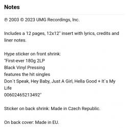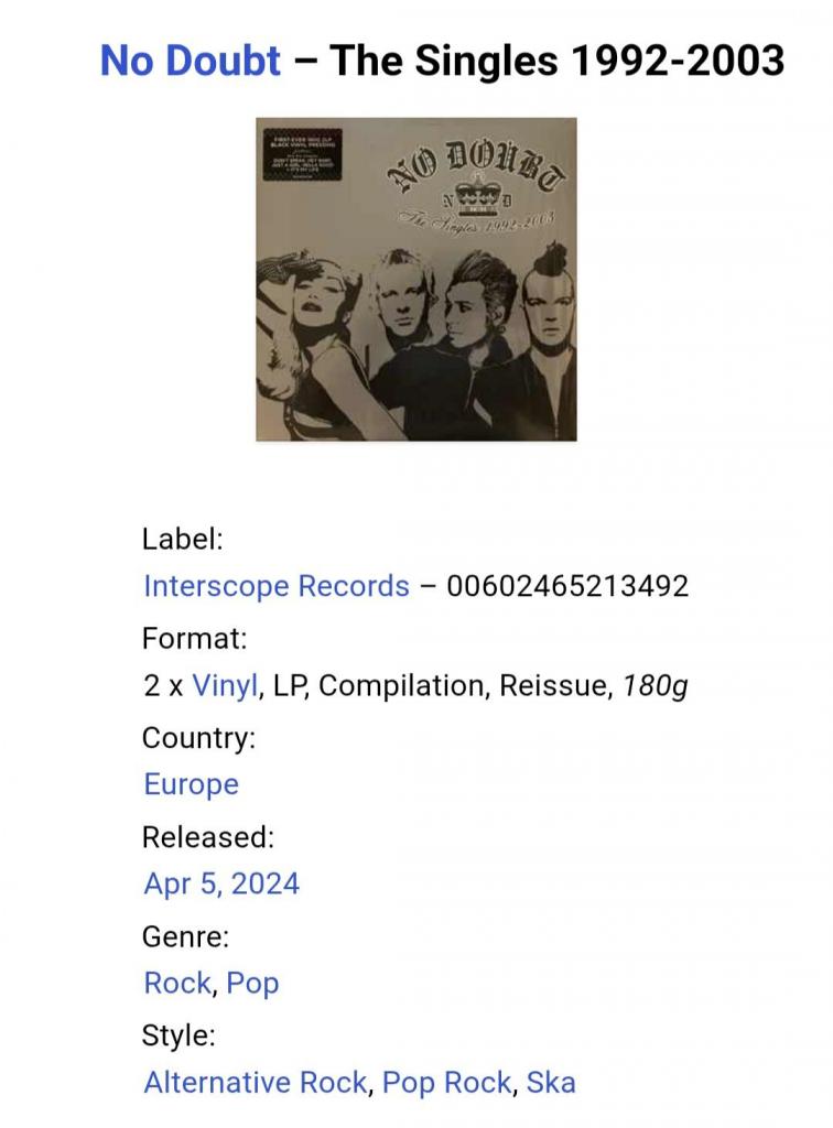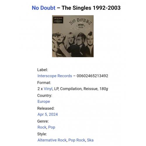 Вінілова платівка. Офіційна збірка синглів, Американської пост-грандж, поп-панк, реп-рок групи нової хвилі, No Doubt, яка складалась з учасників, Гвен Стефані, Тоні Кенела, Едріана Янг, Тома Дюонта, Еріка Стефані та Джона Спенса (The Singles) 1992-2003. Випуск фірми (Interscope Records) Europe, 2024-ий рік. Видання з двох платівок (2LP), нове, запаковане. Категорія S/S. Відправка по Україні службами доставки: Нова Пошта, Укр Пошта, Делівері. Також відправляємо посилки за кордон по цілому світу.
